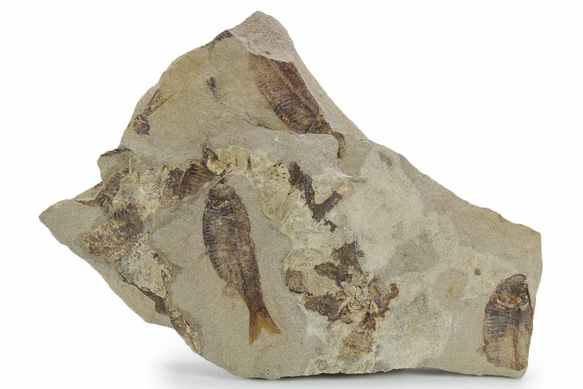 This is a 9.4 x 6.1" mortality plate of detailed fossil herring (Gosiutichthys parvus) from the Green River Formation of Wyoming. It comes from a different location than most of the Green River fish fossils, representing the ancient Lake Gosiute, not Fossil Lake. The preservation is also quite different compared to the fossil fish found in the Fossil Lake deposits, being a course grained mudstone. They are very detailed, with the bony structures, fins, and scales easily seen.