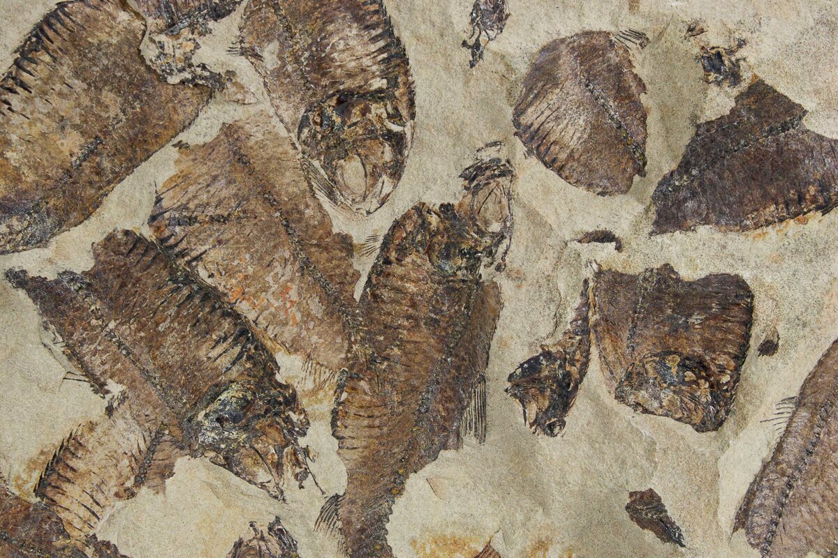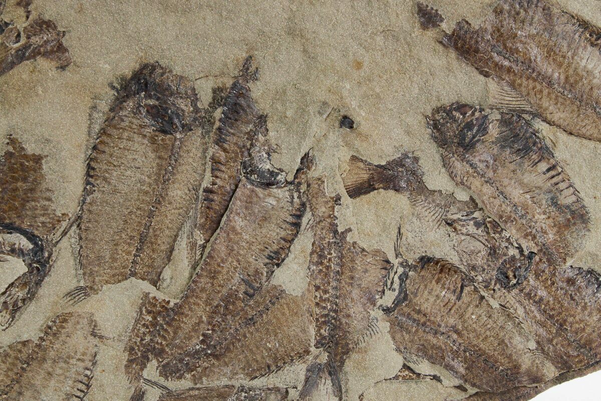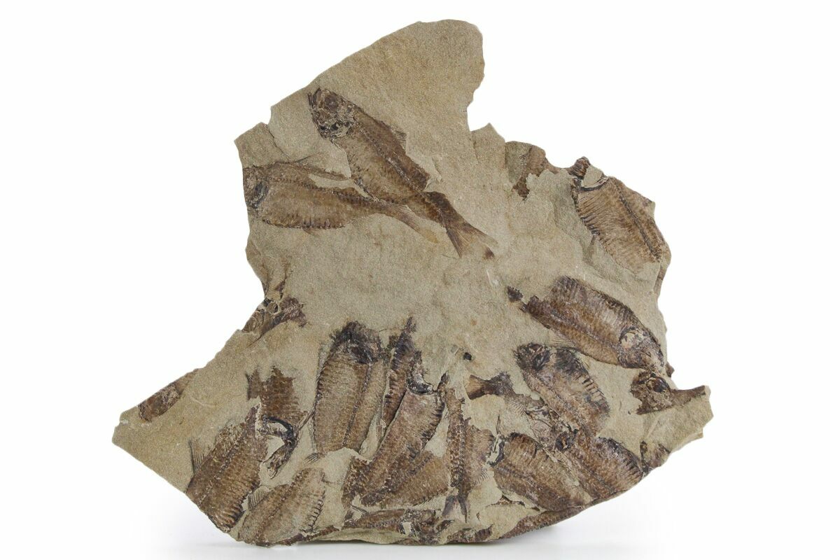 This is a 9.4 x 8.15" mortality plate of detailed fossil herring (Gosiutichthys parvus) from the Green River Formation of Wyoming. It comes from a different location than most of the Green River fish fossils, representing the ancient Lake Gosiute, not Fossil Lake. The preservation is also quite different compared to the fossil fish found in the Fossil Lake deposits, being a course grained mudstone. They are very detailed, with the bony structures, fins, and scales easily seen. Fish can be found on both sides of this plate.