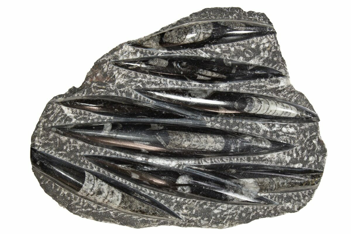 The fossils commonly known as Orthoceras are extinct "straight" cephalopods that lived during the Upper Devonian period around 370 million years ago. Like other cephalopods, they lived inside of their shells, had tentacles they could use to grab food, and used jet propulsion, squirting water to move. The rock containing them is quarried from the Atlas Mountains of Morocco and frequently polished to reveal the fossils and make decorative items with them.