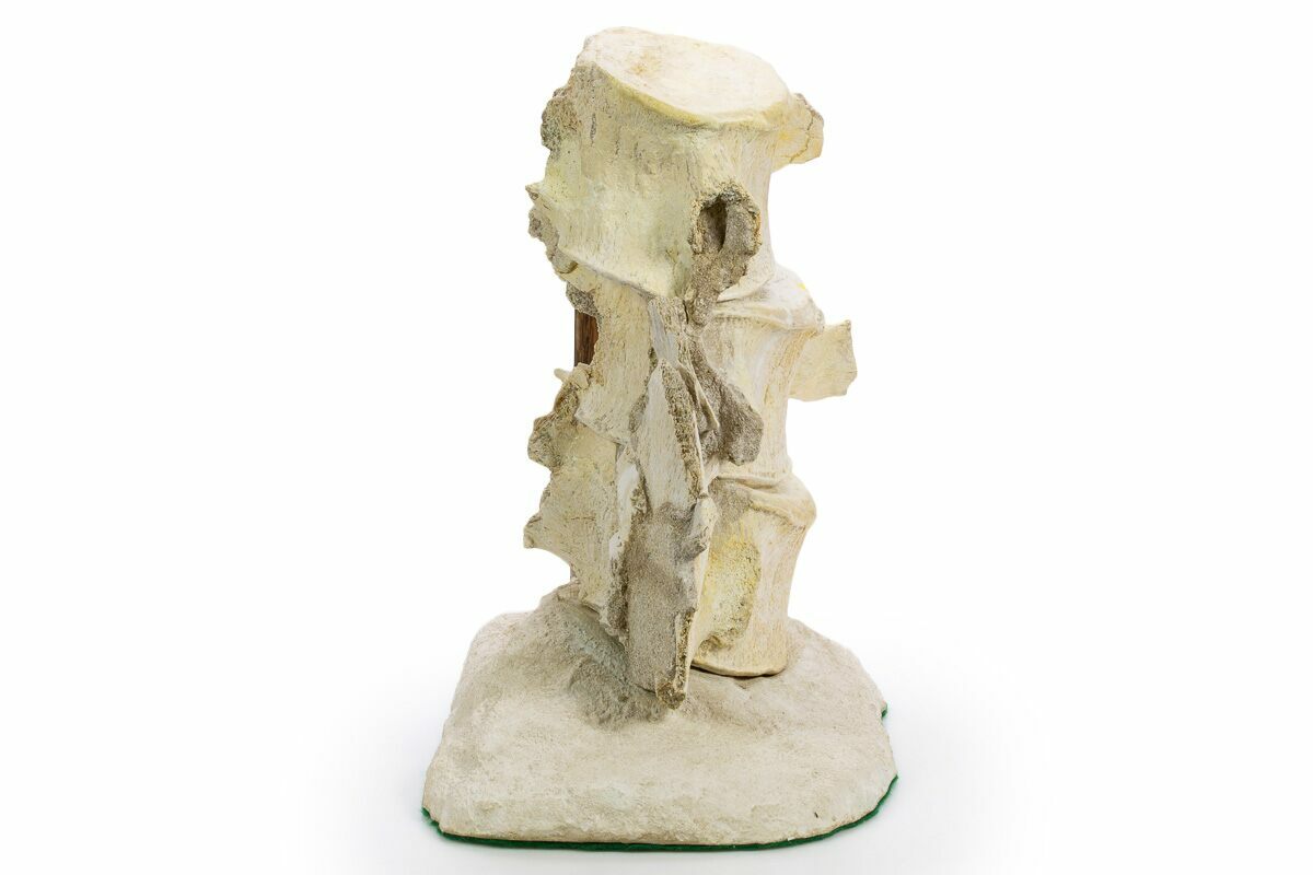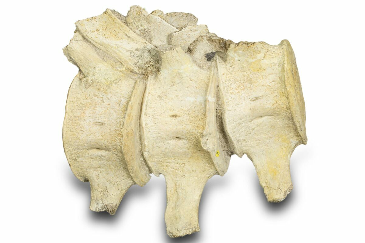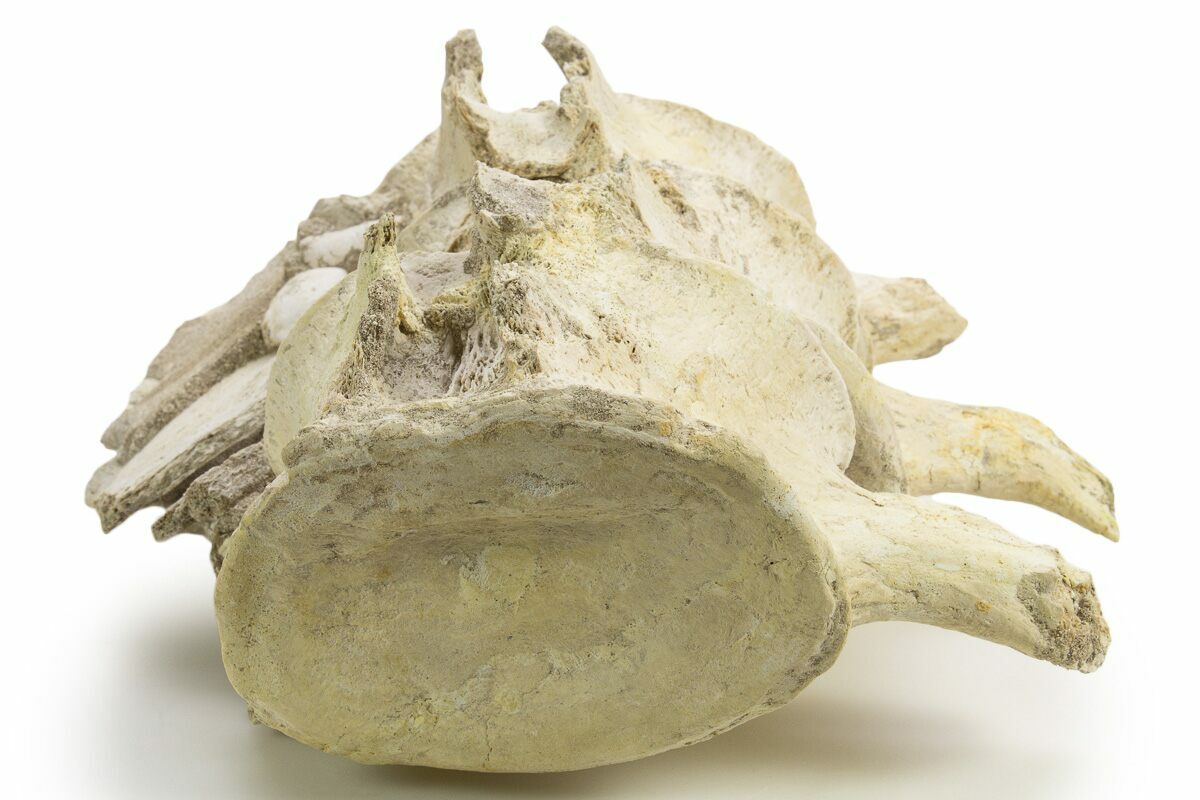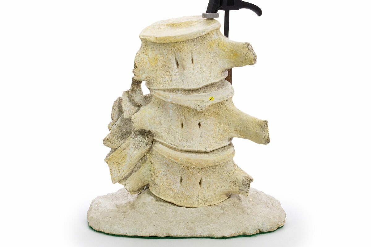 There are a couple repaired cracks through the transverse processes and some small areas of the centrums required some minor gap fill restoration. The sandstone between the vertebrae has been stabilized.