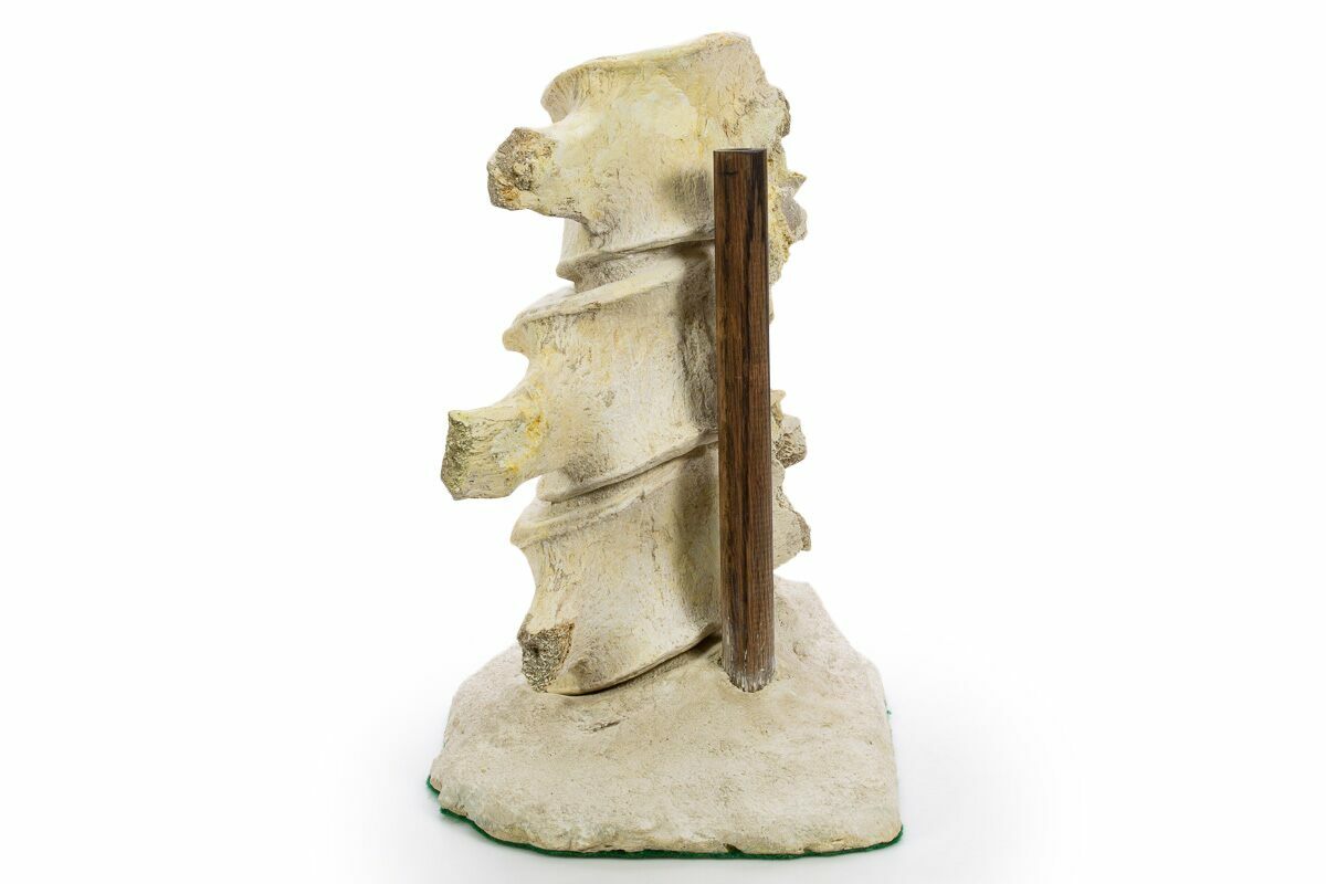This specimen includes a custom display base with a clamp to assist holding the vertebrae vertical. The vertebrae can also be displayed without the clamp as the vertebra fits well within the false rock base.