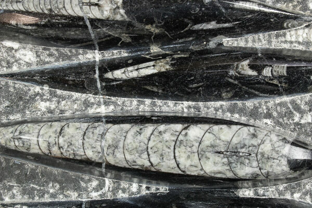 The fossils commonly known as Orthoceras are extinct "straight" cephalopods that lived during the Upper Devonian period around 370 million years ago. Like other cephalopods, they lived inside of their shells, had tentacles they could use to grab food, and used jet propulsion, squirting water to move. The rock containing them is quarried from the Atlas Mountains of Morocco and frequently polished to reveal the fossils and make decorative items with them.