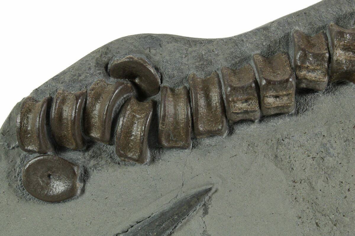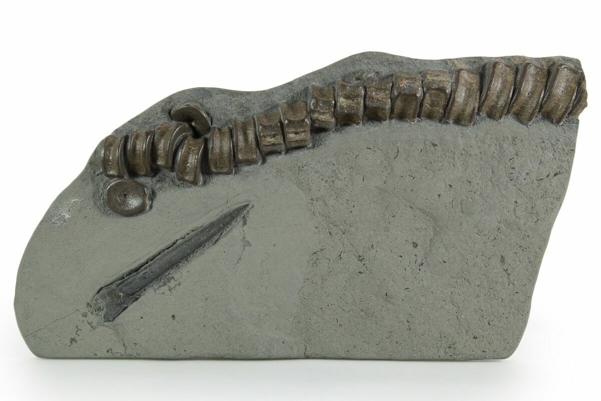 This is a 9.6" wide fossil plate featuring naturally associated, articulated ichthyosaur (Stenopterygius sp.) vertebrae and a belemnite (Youngibelus cf. gigas) rostrum, collected from the Posidonia Shale of Holzmaden, Germany. There are 19 complete vertebrae present in a mixture of articulated and disarticulated fashion.