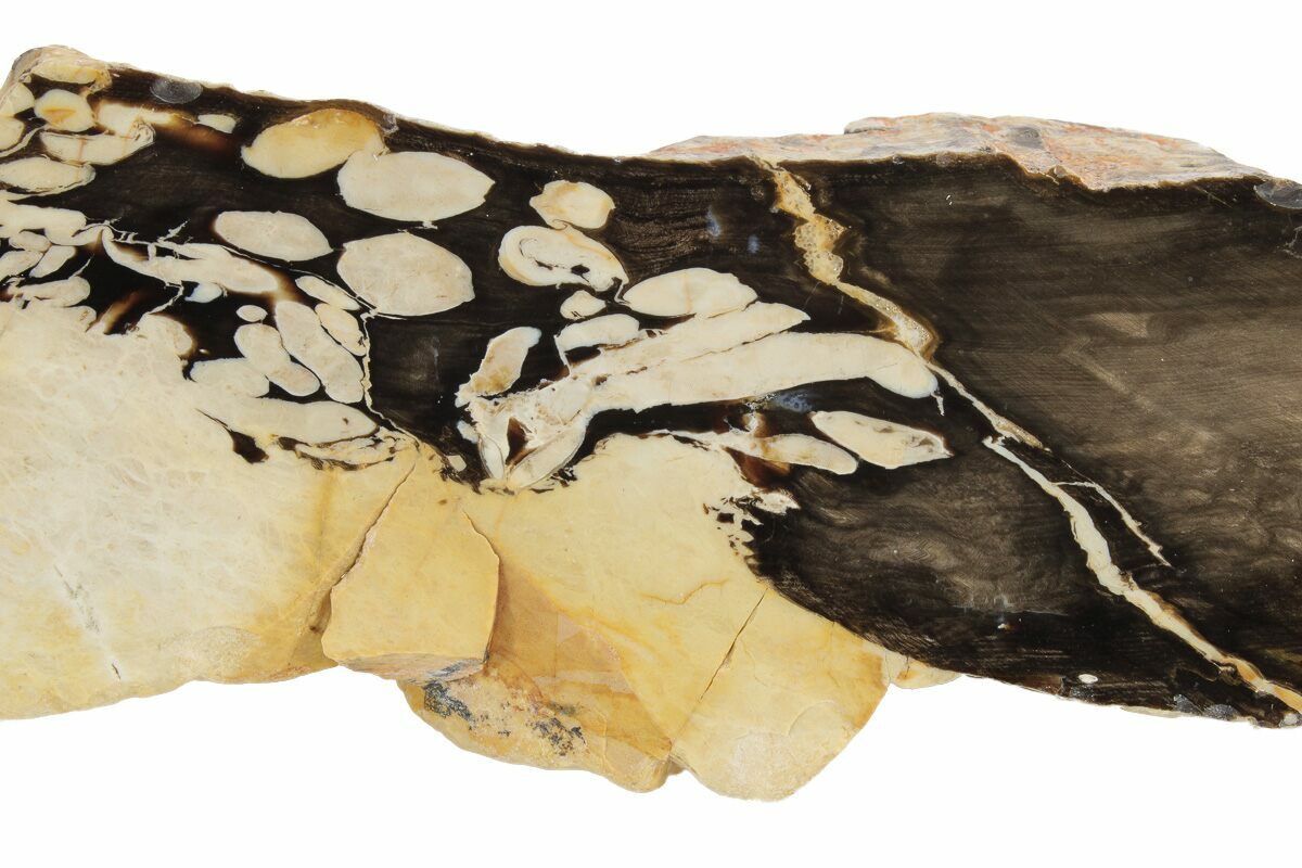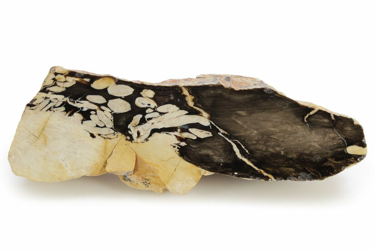 This is a 9.6" polished section of petrified wood (Conifer) from Australia, known as "Peanut Wood". It is actually petrified driftwood that is full of boreholes from clam larvae of the genus Teredo, commonly know as shipworms. These boreholes were filled in by a white mineral during the fossilization process, giving this petrified wood its unique appearance. The wood itself is from Aruacaria, a type of conifer and is Lower Cretaceous in age, or approximately 113 million years old.