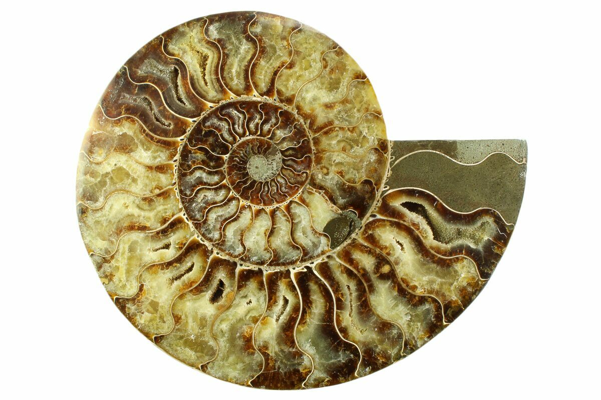 This is a stunning 9.65" wide, cut and polished Cleoniceras ammonite fossil from Madagascar. Dating back roughly 110 million years to the Cretaceous Period, it showcases beautifully mineralized internal chambers, each divided by crisp white calcite septa. The high-gloss polish highlights the intricate suture patterns and warm, earthy tones that make Cleoniceras a perennial favorite among collectors.