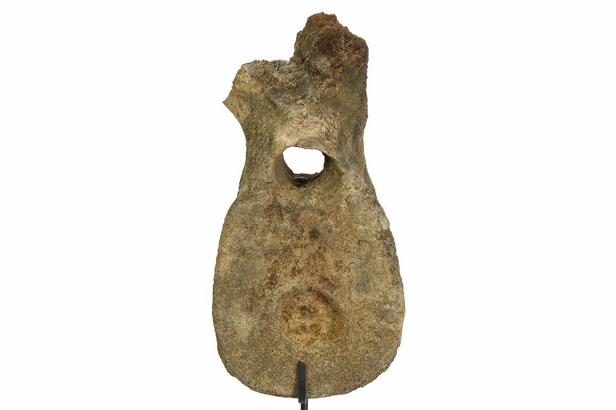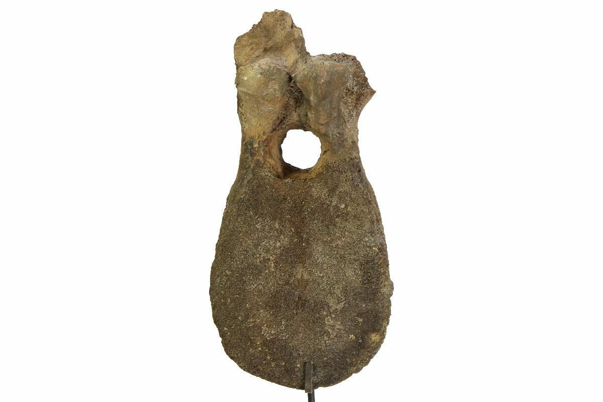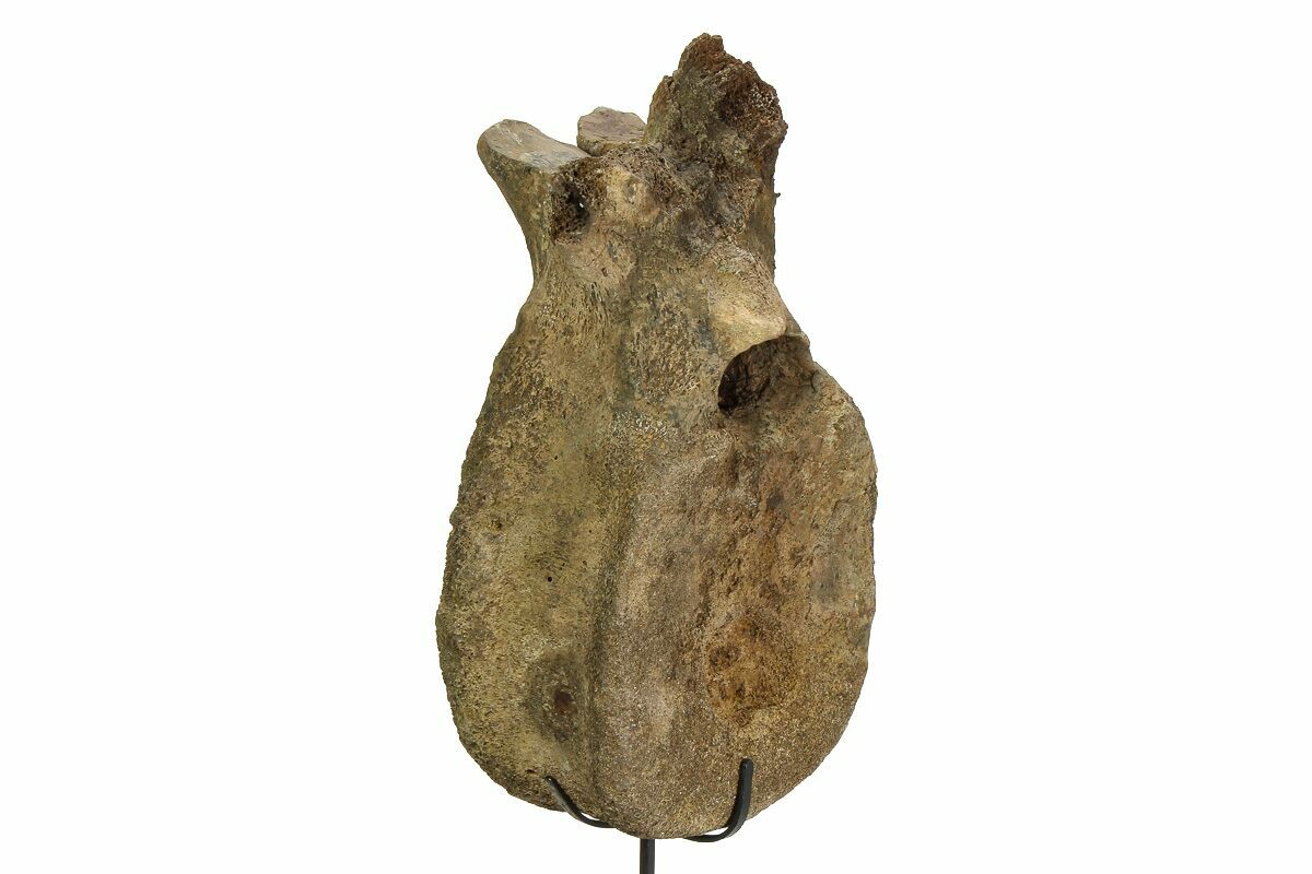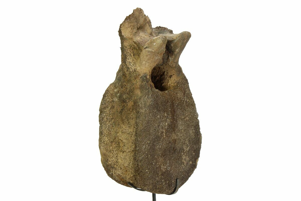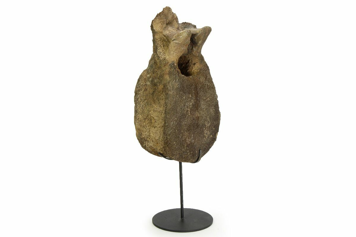 This vertebra measures 9.7" tall by 4.8" wide, with a 3.4" thick centrum, standing just over 14" tall on the accompanied custom metal display stand.
