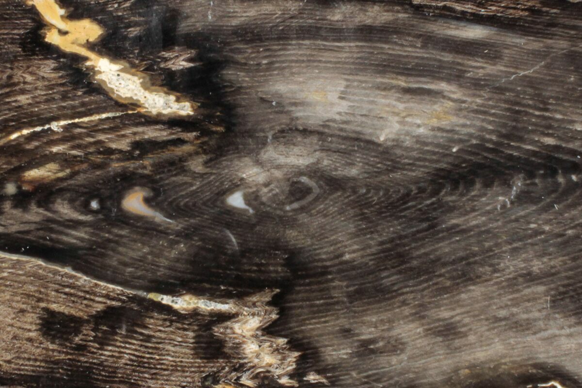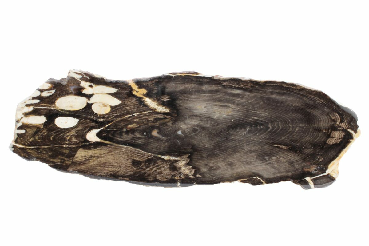 This is a 9.8" polished round of petrified conifer wood from Australia known as "Peanut Wood". It is actually petrified driftwood that is full of boreholes from clam larvae of the genus Teredo, commonly know as shipworms. These boreholes were filled in by a white mineral during the fossilization process, giving this petrified wood its unique appearance. The wood itself is from Aruacaria, a type of conifer and is Lower Cretaceous in age, or approximately 113 million years old.