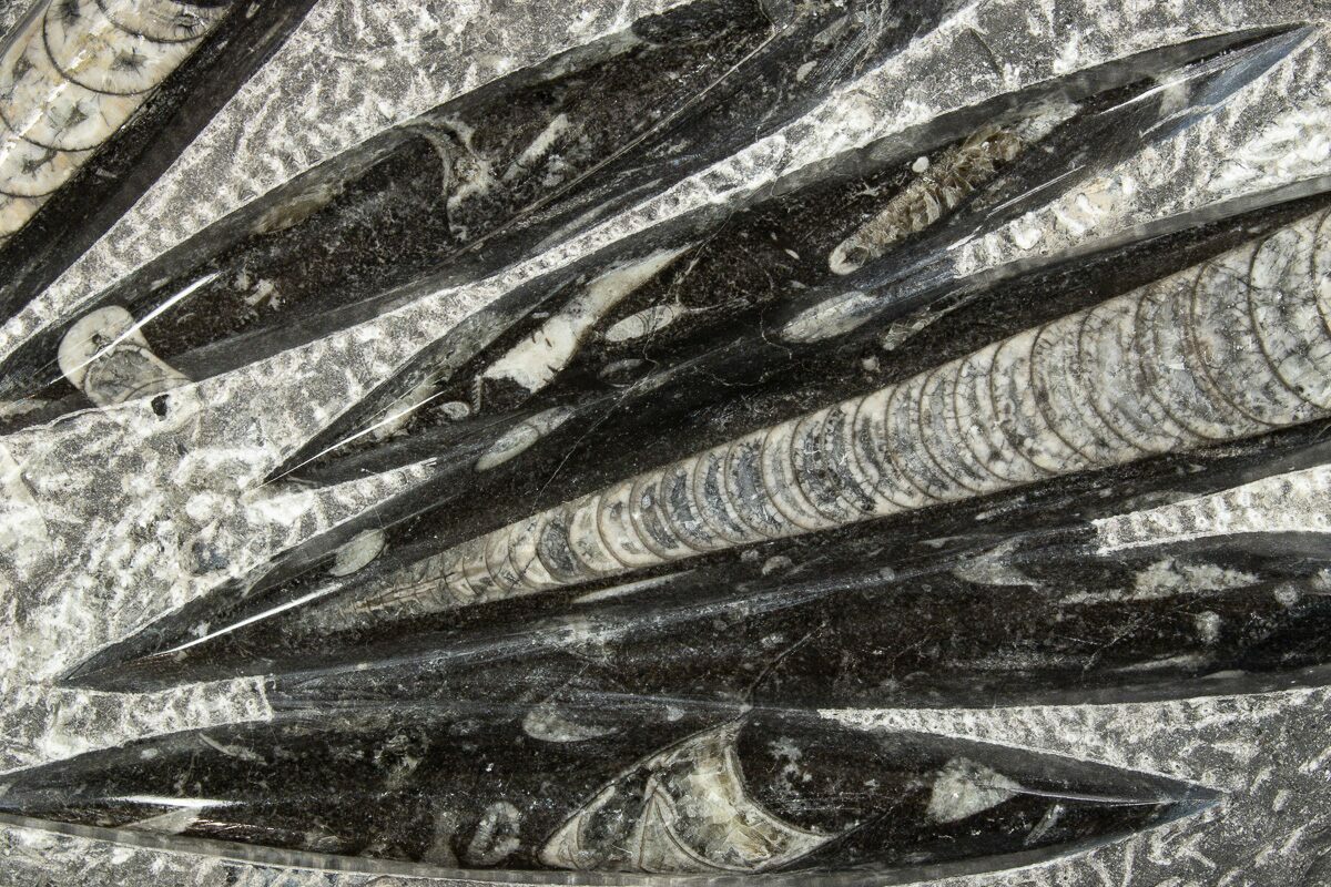 The fossils commonly known as Orthoceras are extinct "straight" cephalopods that lived during the Upper Devonian period around 370 million years ago. Like other cephalopods, they lived inside of their shells, had tentacles they could use to grab food, and used jet propulsion, squirting water to move. The rock containing them is quarried from the Atlas Mountains of Morocco and frequently polished to reveal the fossils and make decorative items with them.