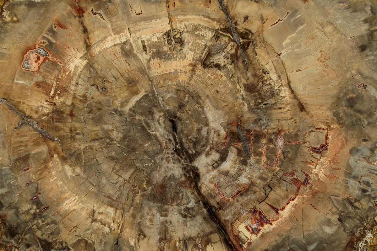 Madagascar petrified wood comes primarily from extensive Triassic-aged deposits in the Mahajanga Basin of northwestern Madagascar, where ancient conifer forests—often attributed to species related to Araucarioxylon—were buried by volcanic ash and floodplain sediments roughly 225–240 million years ago. Over immense spans of time, silica-rich fluids percolated through these sediments, replacing the cellular structure of the wood with chalcedony, jasper, agate, and quartz while preserving growth rings, bark textures, and even microscopic details. The region’s unique geochemistry—especially its iron, manganese, and occasionally copper content—produces the vivid palette Madagascar petrified wood is famous for, including deep brick reds, golden yellows, smoky blacks, and pastel pinks. Many logs are found fully silicified and naturally fractured into large, rounded segments that local artisans cut into slabs, spheres, eggs, and freeforms. These deposits stretch across arid badlands where erosion steadily exposes new material, making Madagascar one of the world’s premier sources of highly colorful, beautifully patterned fossil wood.