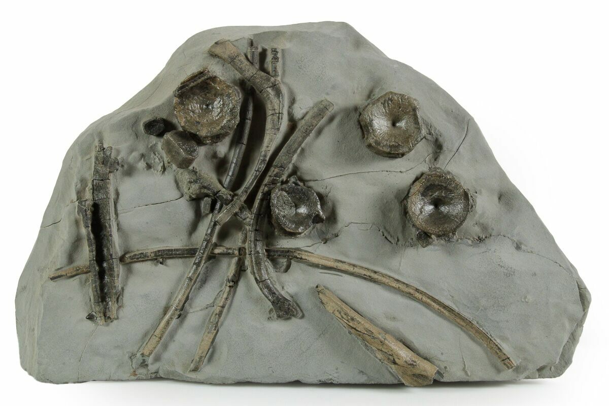 This is a really cool 9.9" wide plate of rock containing Ichthyosaurus communis vertebrae, ribs, and a couple additional bone fragments. It was collected from the Lower Jurassic-aged Obtusum Zone in Dorset, England. The bones have been meticulously exposed from the rock to bring them out in high relief.