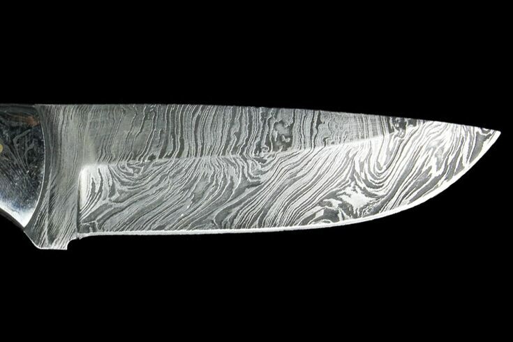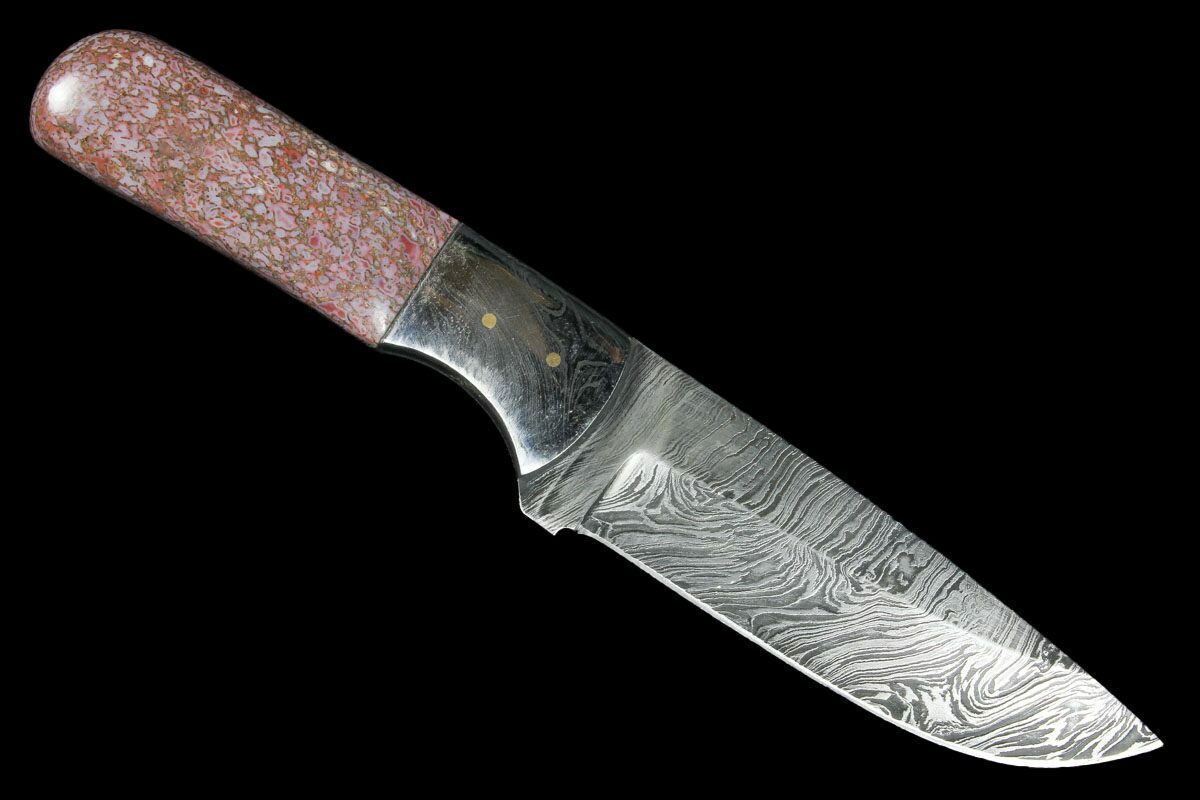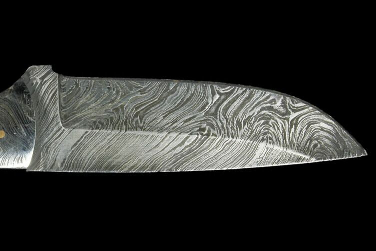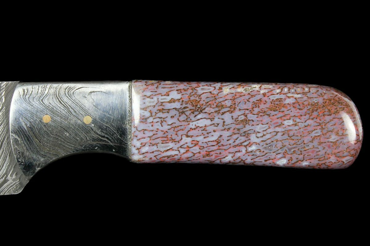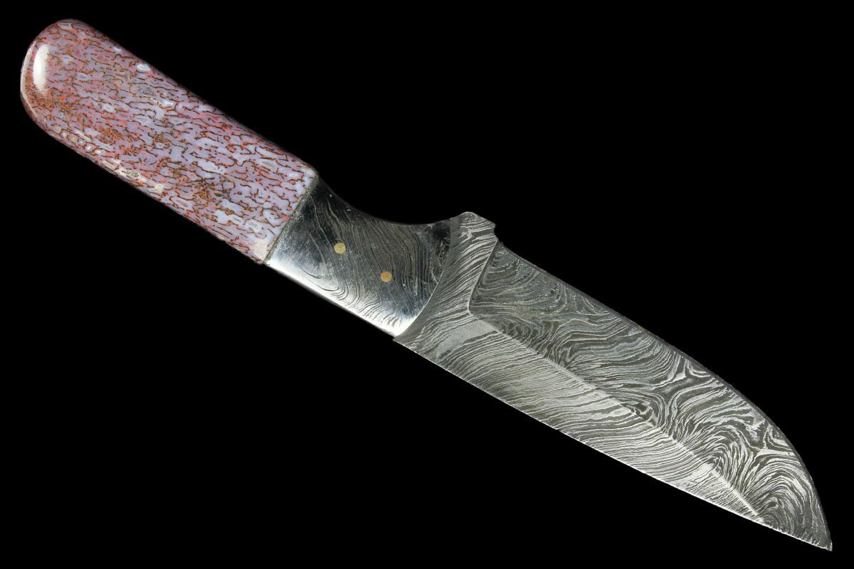 This is a 9" long, damascus steel knife with a handle made out of polished, purple/blue, agatized dinosaur bone (Gembone). The bone is from the Morrison Formation in Utah and is approximately 150 million years old. Comes with a carrying case.
