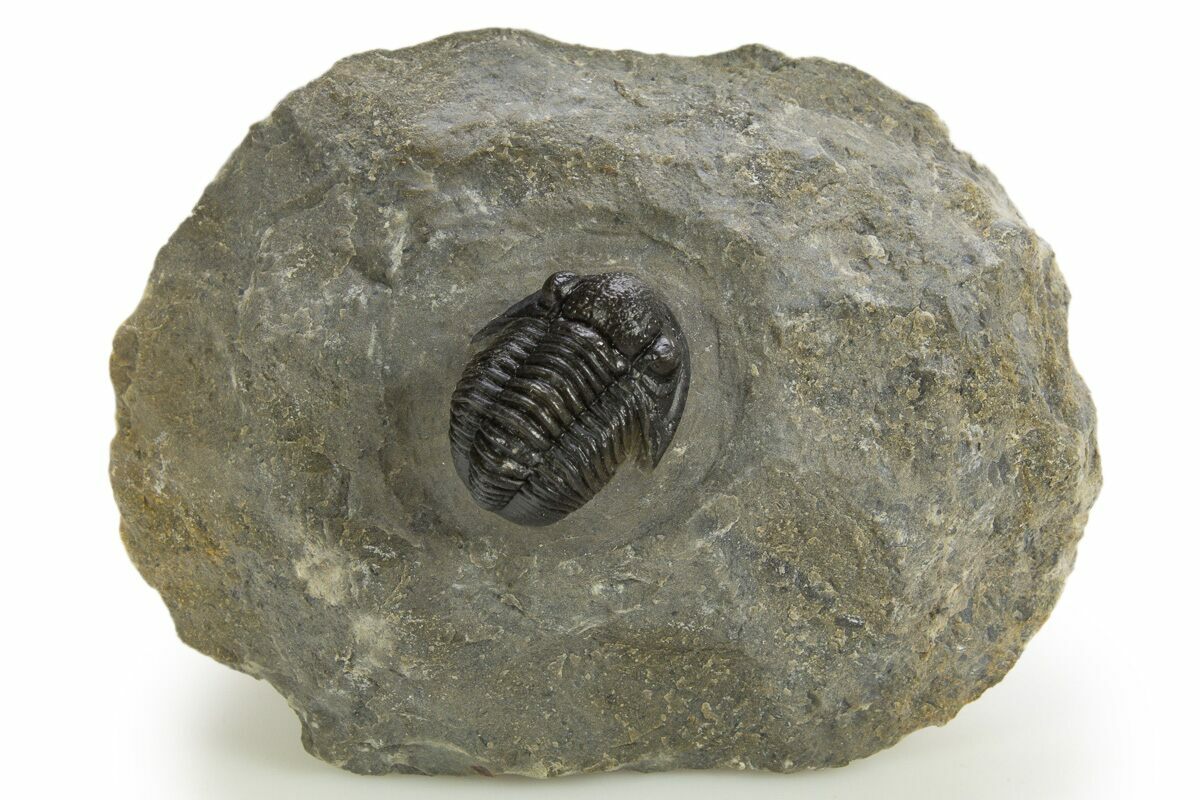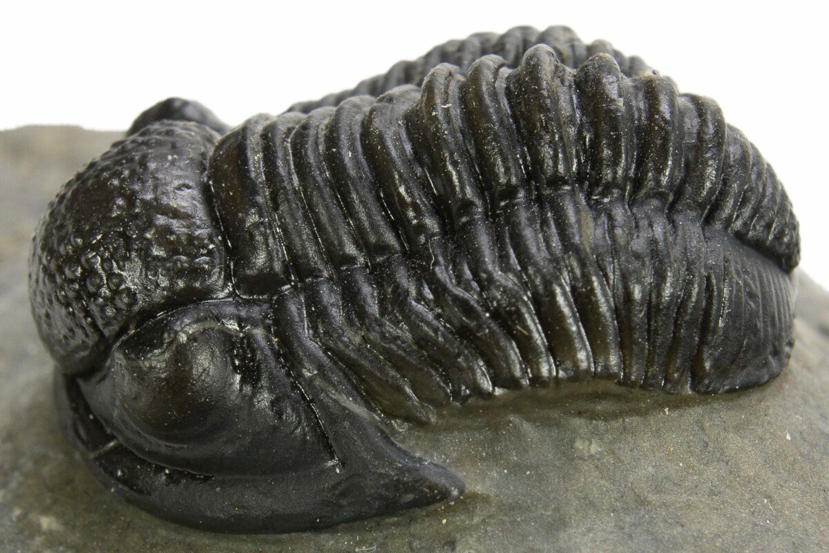 1This is a detailed, .9" long specimen of the proetid trilobite, Gerastos, collected from Issoumour, Morocco.