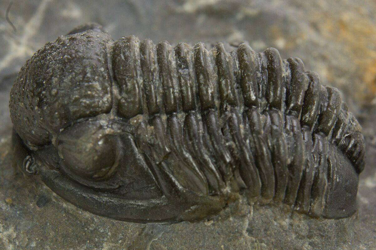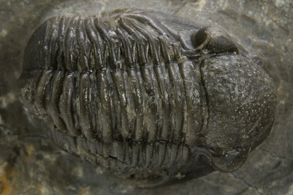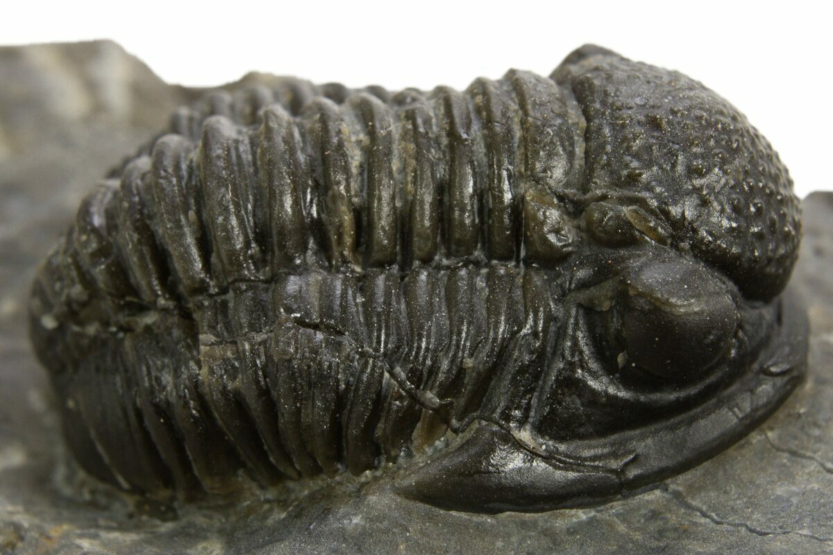 1This is a detailed, .9" long specimen of the proetid trilobite, Gerastos, collected from Issoumour, Morocco.