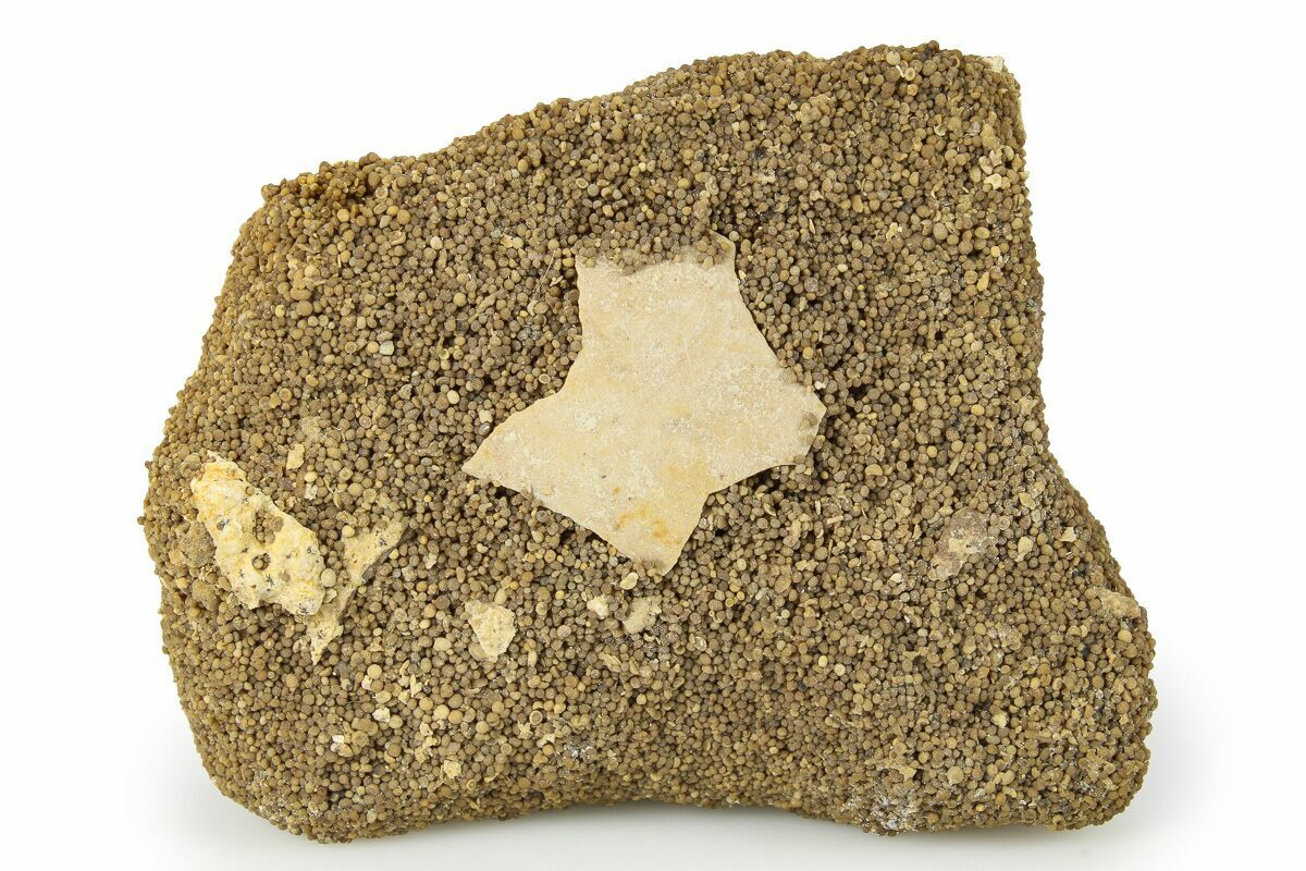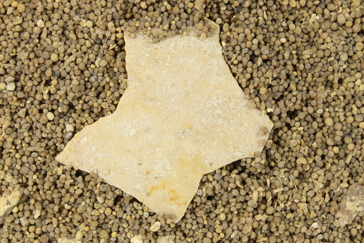 This is a rare find! This is a .9" beautifully preserved fossil bird egg shell from Montaigu-le-Blin in central France. It is preserved on an unusual conglomerate matrix: it consists of nearly spherical grains made of what looks like chalcedony in radiating bands.