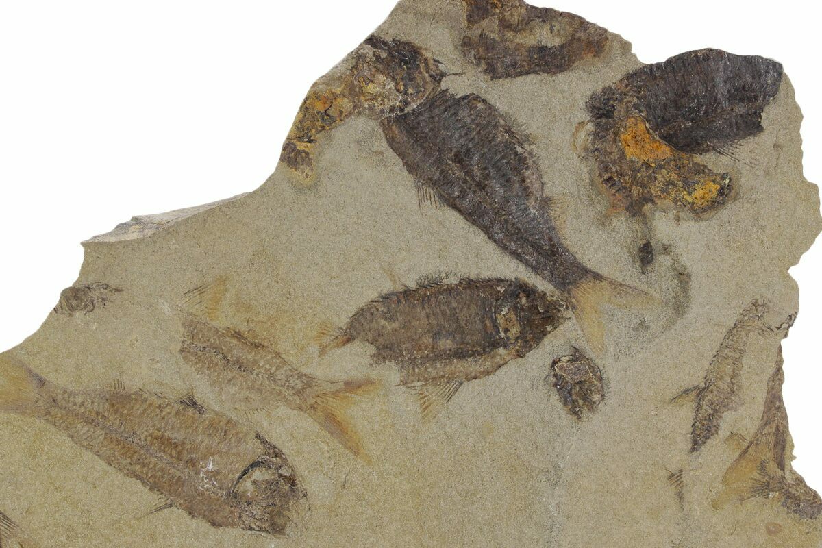 This is a 9 x 6.5" mortality plate of detailed fossil herring (Gosiutichthys parvus) from the Green River Formation of Wyoming. It comes from a different location than most of the Green River fish fossils, representing the ancient Lake Gosiute, not Fossil Lake. The preservation is also quite different compared to the fossil fish found in the Fossil Lake deposits, being a course grained mudstone. They are very detailed, with the bony structures, fins, and scales easily seen.