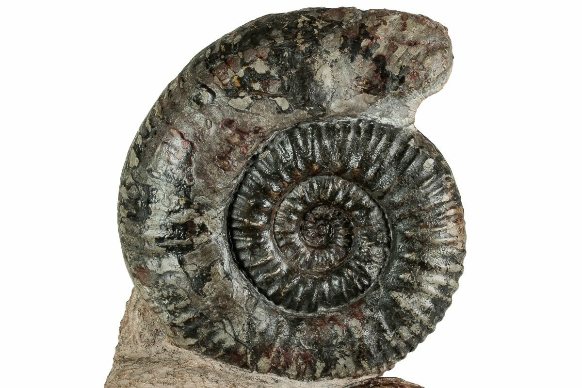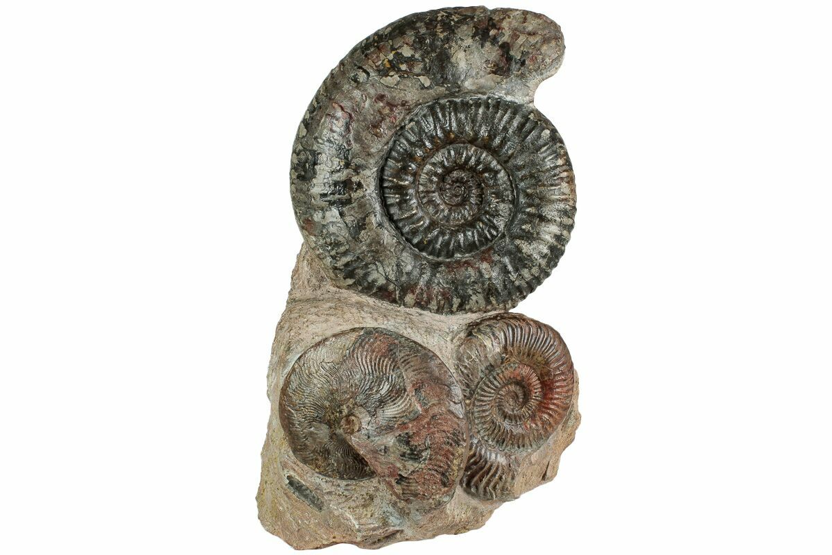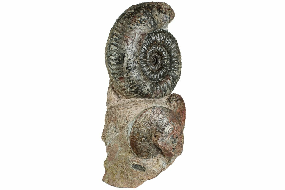 This is a beautiful display piece featuring a pair of Hammatoceras and Pseudogrammoceras ammonites from Belmont, France. It measures 9" tall and the base of stone has been cut flat so that is displays nicely on a hard surface without the need for a display stand. These ammonite fossils are Lower Jurassic (Toarcian Stage) in age, or around 180 million years old.