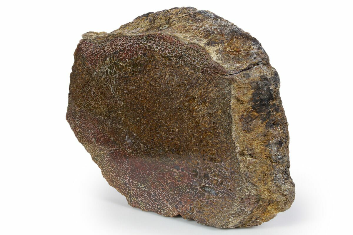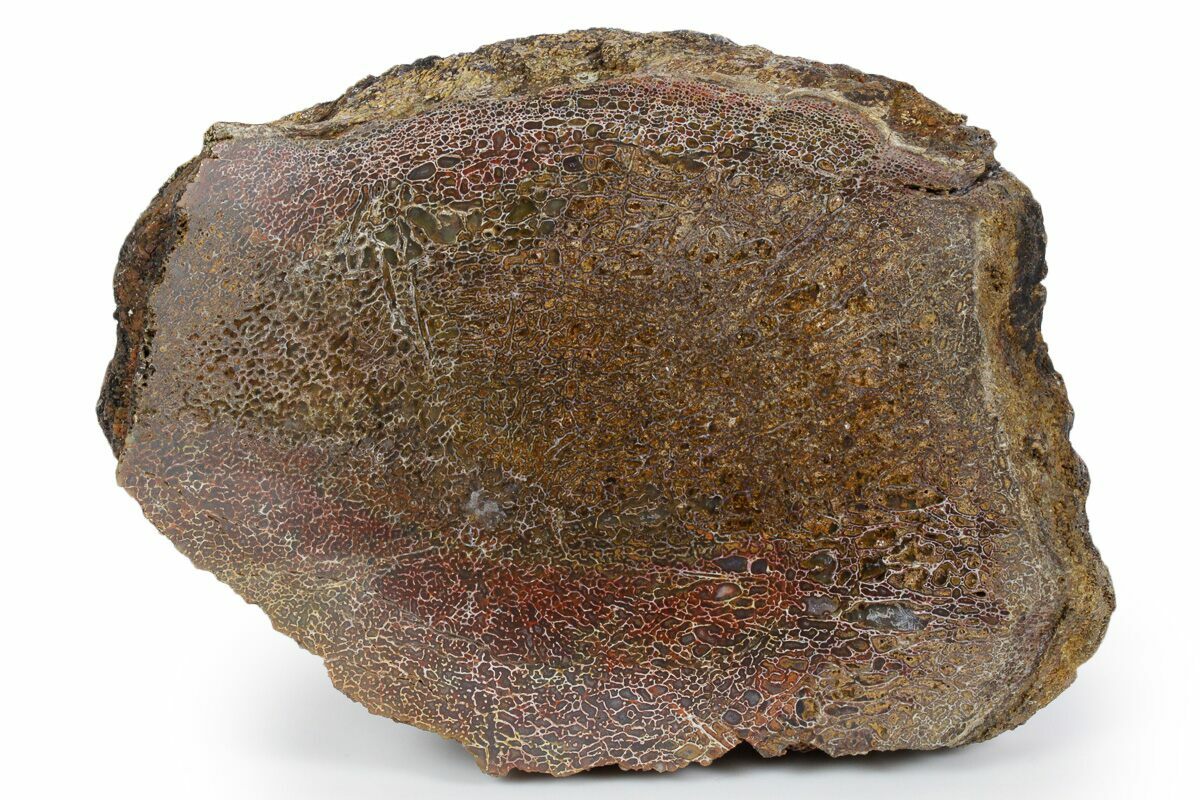 This is a very vibrant, 9" wide section of an agatized sauropod dinosaur vertebra (gembone) from the Morrison Formation in New Mexico. It is cut flat and polished to a glossy finish on one side while the opposite side has been left in its rough state.
