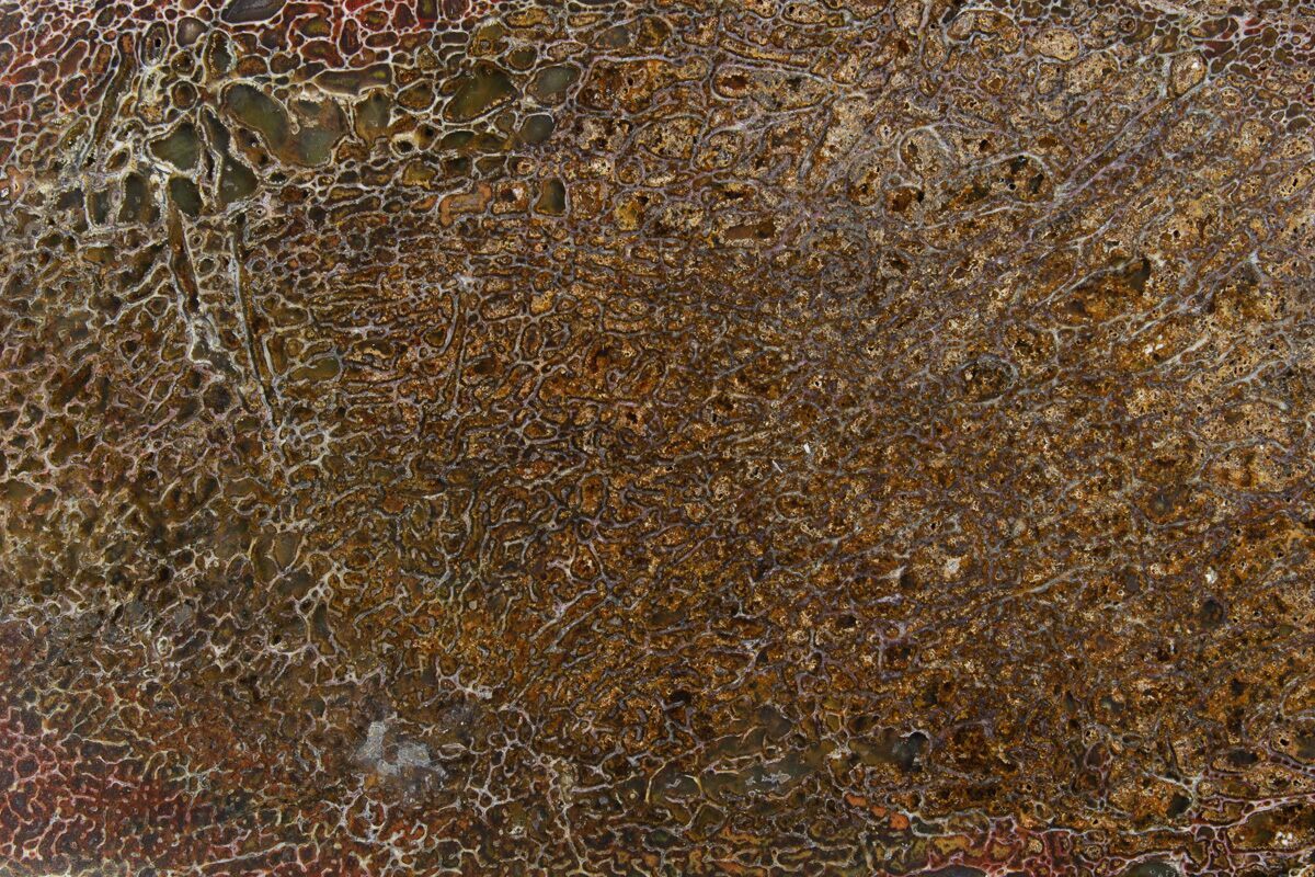 Dinosaur gembone (agatized dinosaur bone) forms when the porous structure of dinosaur bone is replaced by silica-rich minerals like agate, chalcedony, or jasper. This preserves the bone’s internal cell patterns, creating striking, web-like textures visible when polished.