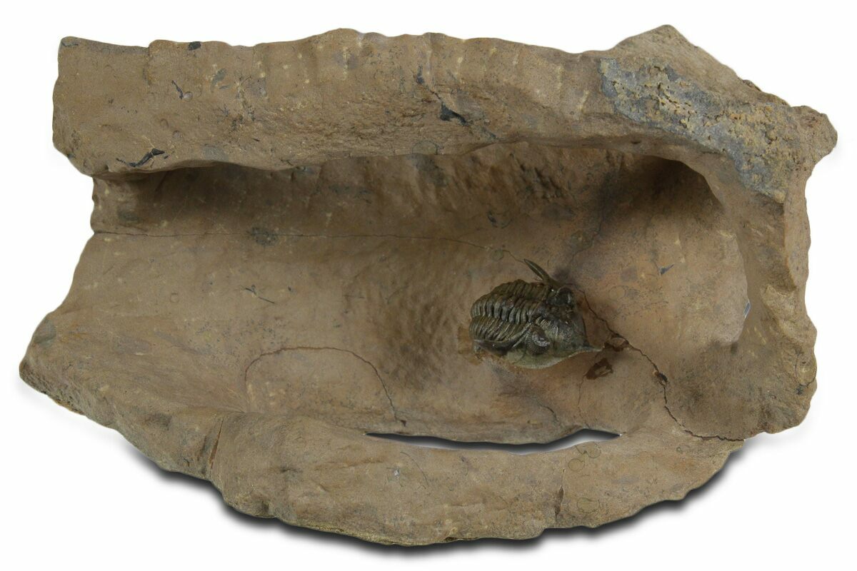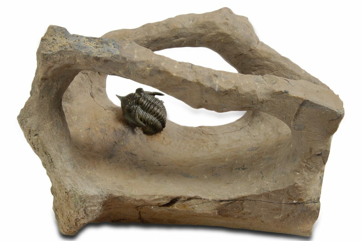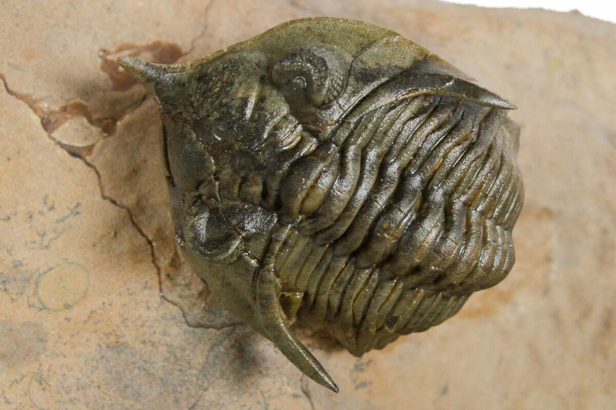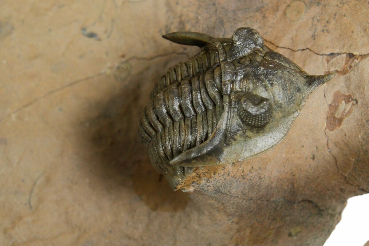Here is a top quality, .9" long, Pseudocryphaeus minimus trilobite from the Devonian of Morocco. It's an elegant example of the order Phacopida with a distinctive rostrum projecting from the front of its head. Excellent preservation on this diminutive trilobite and the stone has been artistically sculpted.
