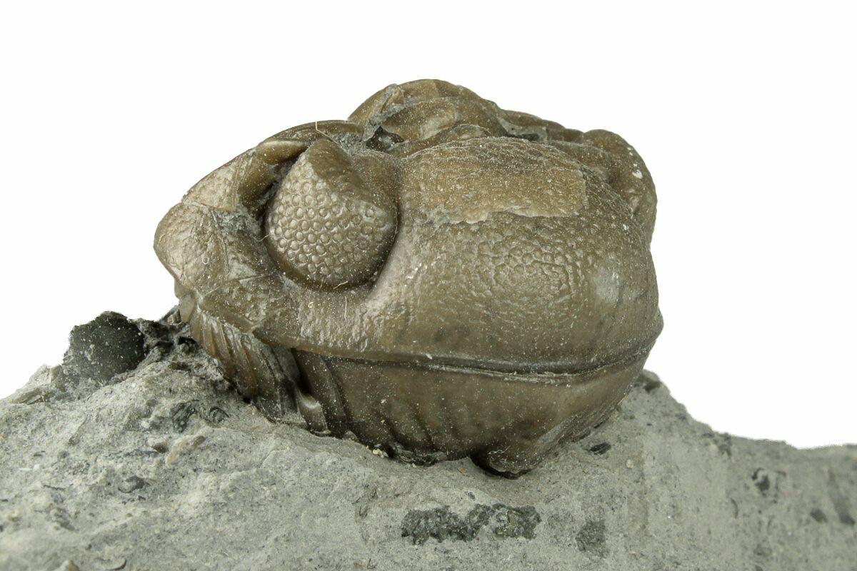 This is a .9" wide, enrolled Eldredgeops rana crassituberculata trilobite from the Silica Formation of Ohio. It has nice eye facet preservation is was left partially embedded in the shale it was found in. It would have probably been about 1.5" long if outstretched.