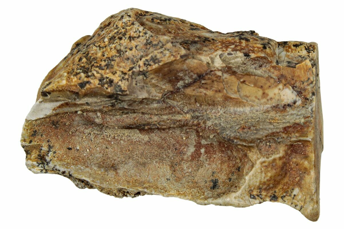 This specimen is one of those naturally shed teeth and features a polished chewing surface, showing clear evidence of the wear that came from processing vegetation millions of years ago.