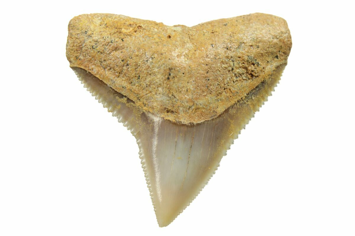 This is a serrated, .91" fossil bull shark (Carcharhinus leucas) tooth collected from a unique and rare locality in Angola, Africa. It comes from the Luanda Formation, making it Late Miocene - Early Pliocene in age. This material was collected by a geologist working in the country about 15 years ago, so there are almost no Angola shark teeth out there. The label the geologist provided with the teeth indicated they came from the town of Paredes, Angola, however this is located over Precambrian-aged sediment. However, there are Neogene-aged deposits northwest of Parades, likely being the deposit these teeth were collected from.