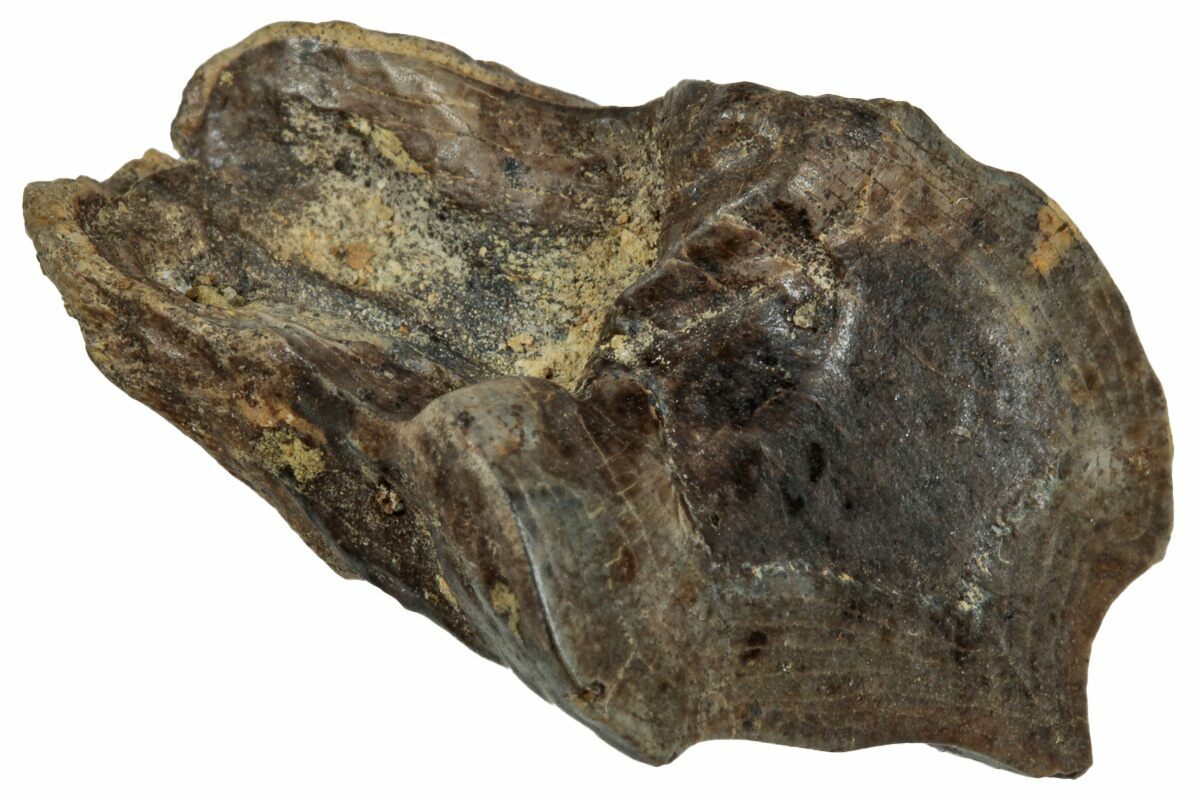 This is an authentic tooth from the iconic horned dinosaur, Triceratops horridus, collected from the Hell Creek Formation of Montana. Triceratops possessed a massive “dental battery” made up of hundreds of tightly packed teeth, perfectly designed for slicing and grinding tough, fibrous plants. As these teeth wore down, they were continuously replaced—collectors often refer to the shed examples like this as “spitters.”