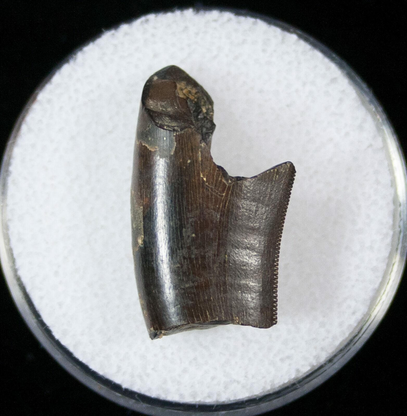This is a .91" long partial Tyrannosaur tooth from the Hell Creek Formation of Montana. It has a some beautiful enamel and some sharp serrations to the posterior edge. It comes in an acrylic display case.
