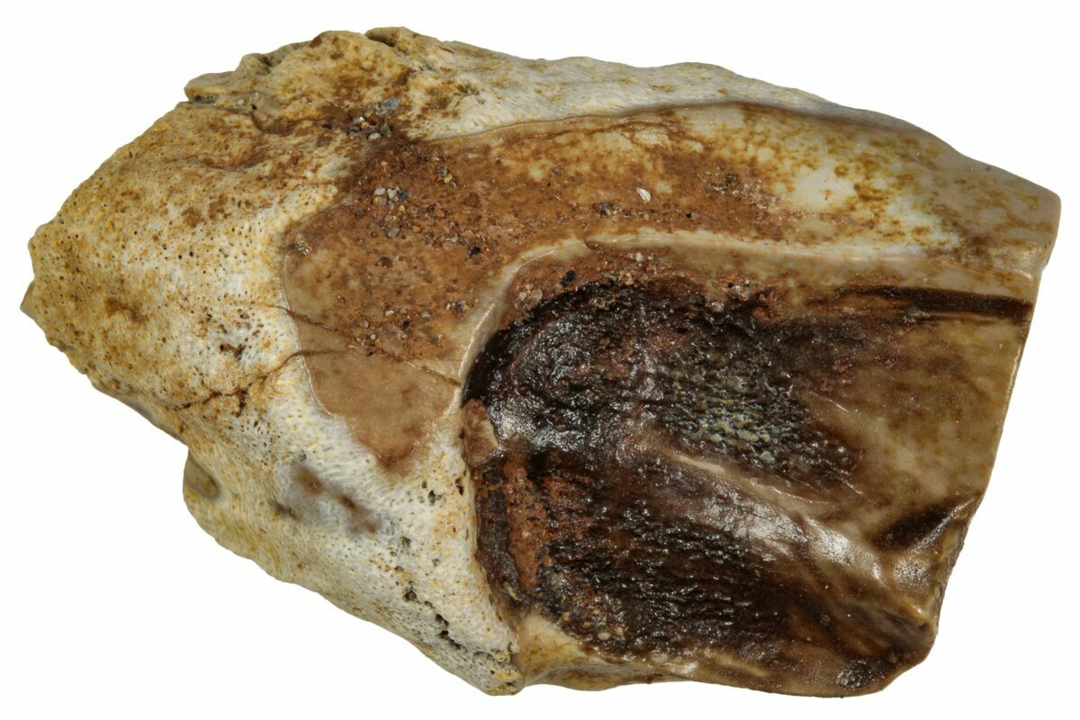 This specimen is one of those naturally shed teeth and features a polished chewing surface, showing clear evidence of the wear that came from processing vegetation millions of years ago.