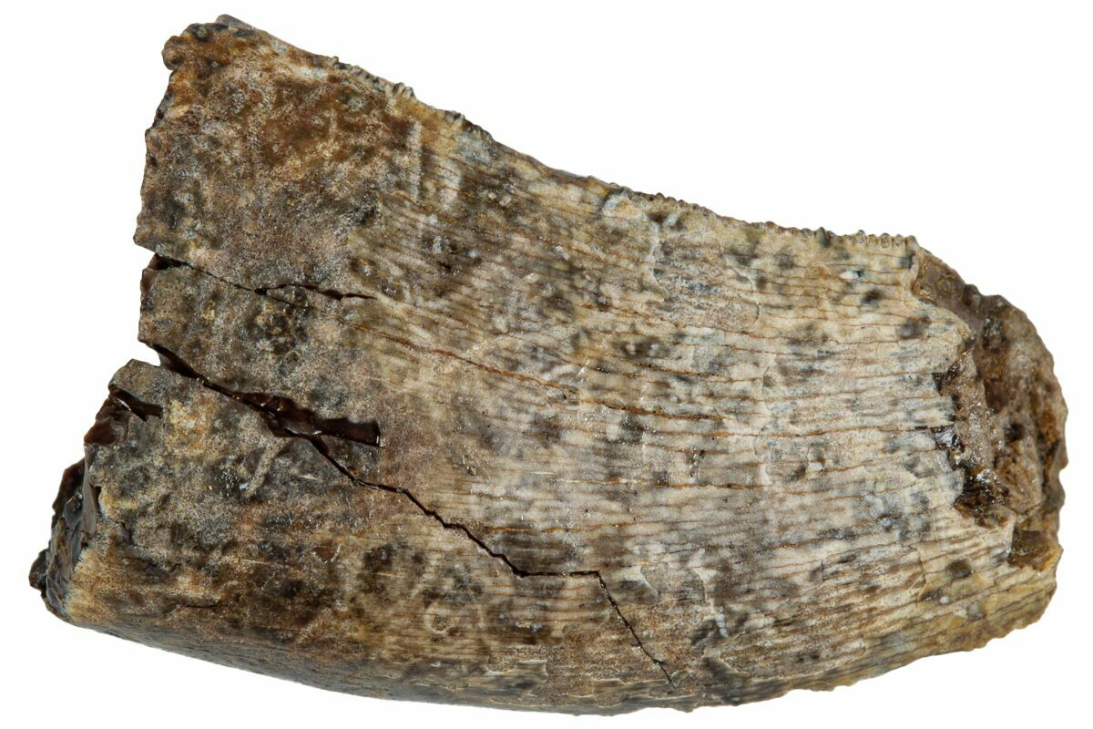 This is a .93" long tyrannosaur tooth likely of the species Nanotyrannus lancensis, collected from the Lance (Creek) Formation in Wyoming. The enamel and serrations along both edges are weathered and the tip is missing.