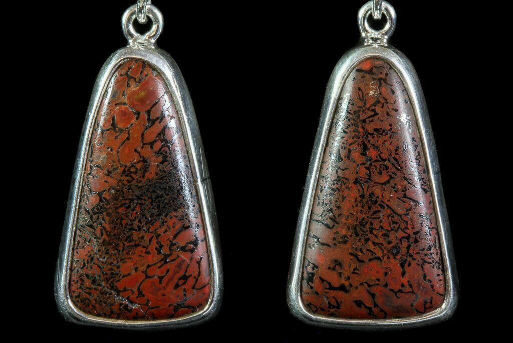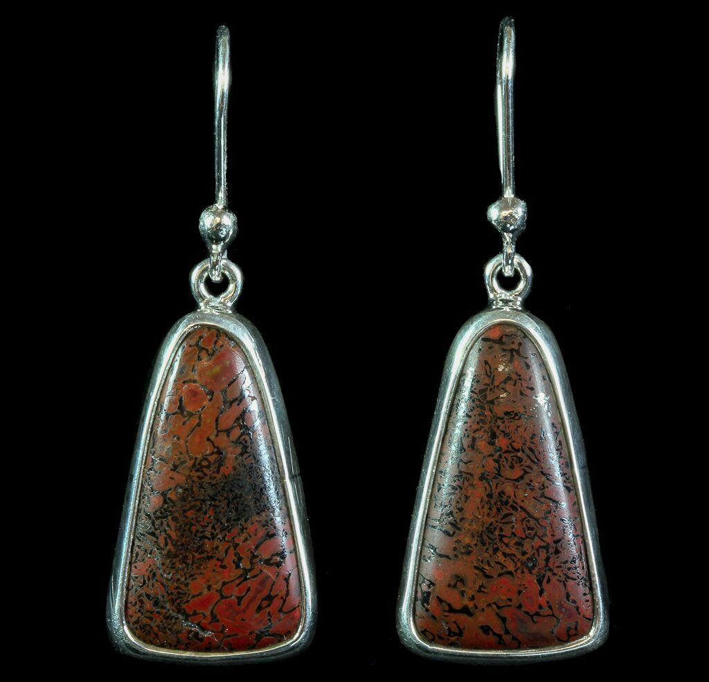 These are beautiful earrings made from 150 million year old agatized dinosaur bone. They were handcrafted in Utah. The internal cell structure of the dinosaur bone can clearly be seen. Only high grade, gem quality bone was used in these earrings and the setting is 100% sterling silver.