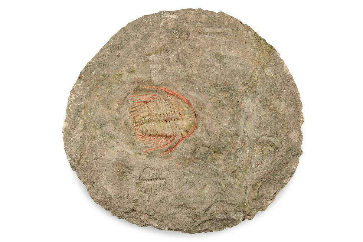 This is a colorful, .95" long, Kettneraspis trilobite which is almost certainly a new species. It closely resembles Kettneraspis pigra described from Europe. These Odontopleurids come from Timrzit, Morocco are are found compressed and, preserved in white, orange and pinkish colorations.