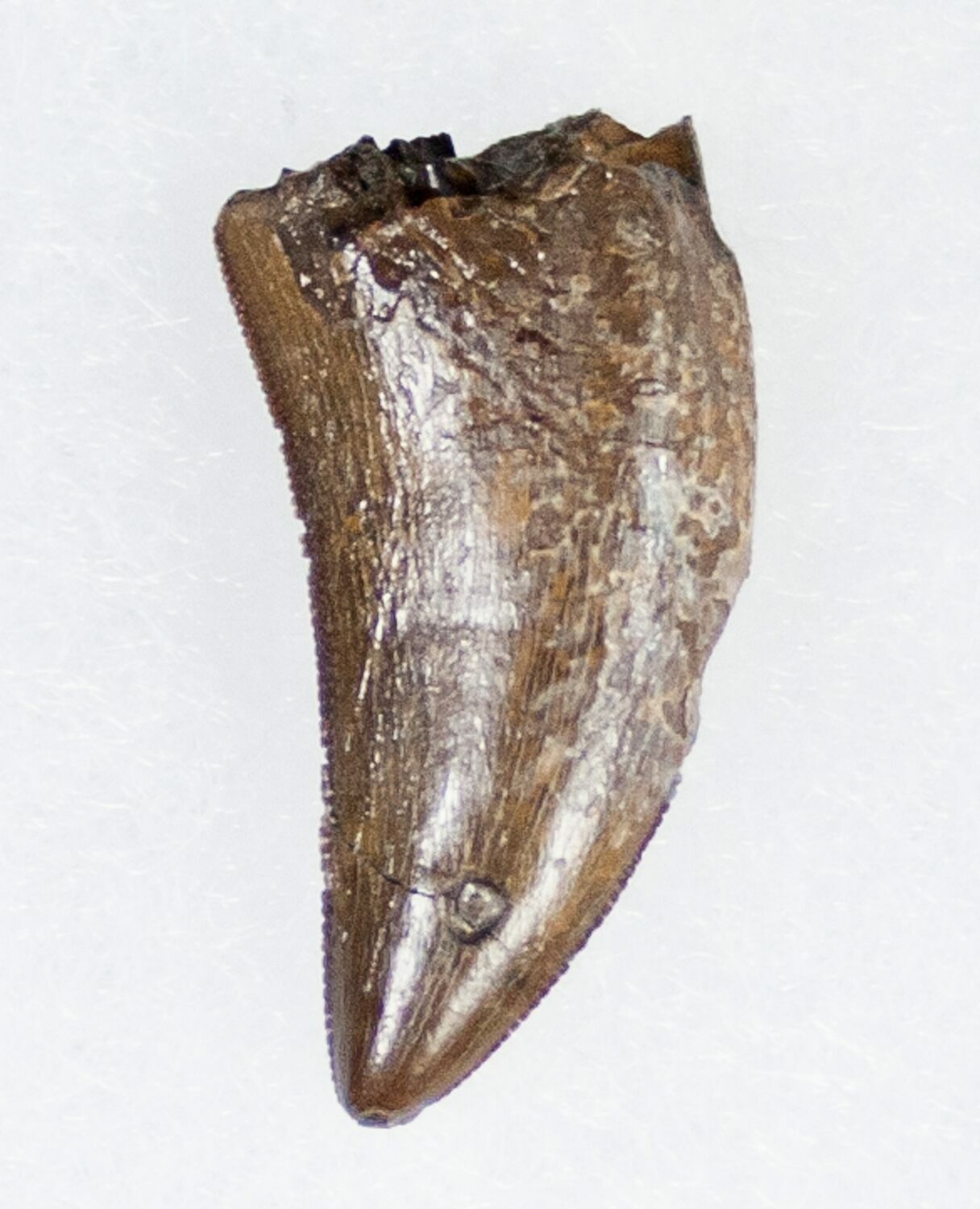 This is a .95" long Tyrannosaurid tooth of the genus Nanotyrannus lancensis from the Hell Creek Formation of South Dakota. Most of the enamel is in good shape with some enamel wear right at the tip and base. The fine inner serrations are well preserved but most out the outer ones are missing. No restoration or repair and comes with an acrylic display case.