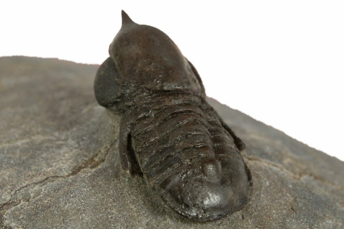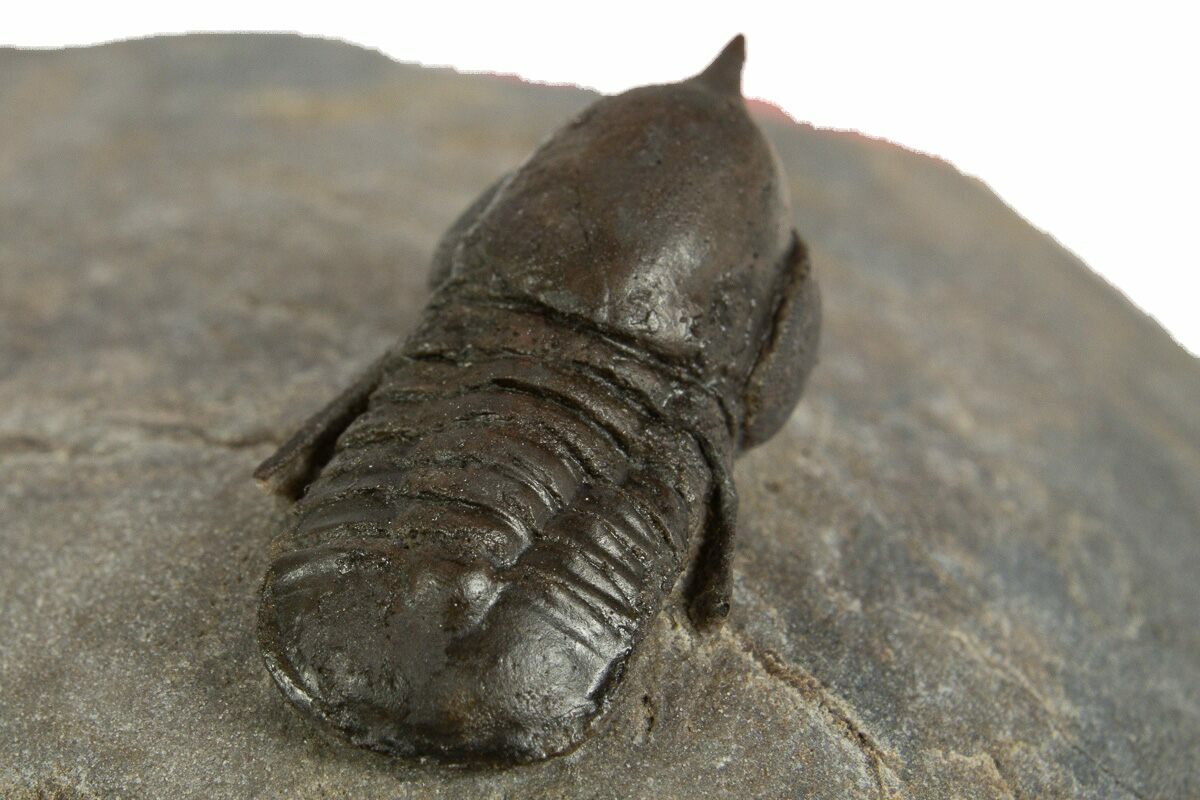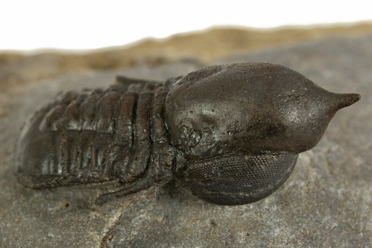 This is an exceptional .95" long example of an unusual pelagic trilobite (Cyclopyge) from El Kaid Rami, Morocco. Nearly all of the Cyclopyge you see from Morocco are flattened on shale and not 3D like this specimen. Both eyes on this specimen have incredible preservation. This one has about 3-4% shell restortion, primarily on its head.