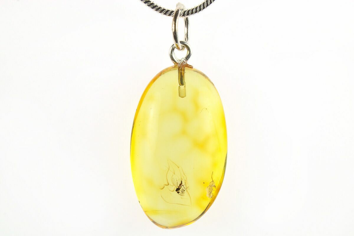 This is a .95" tall (including loop) pendant made from 44 million year old Baltic amber. Within the amber, a small fossil fly (order Diptera) can be seen. A loop has been attached to the amber, along with a secondary ring for the included 24" silver plated snake chain to complete the necklace.
