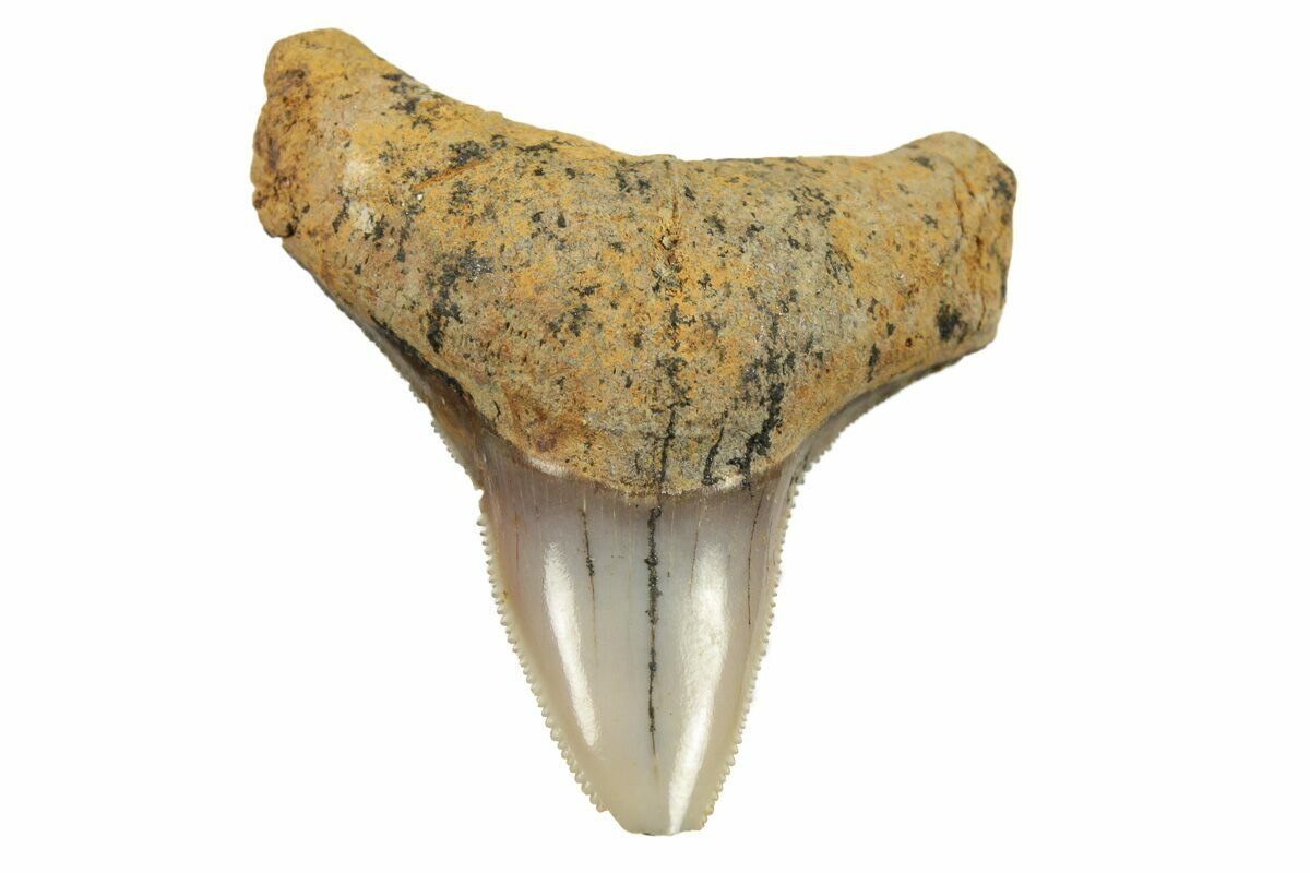 This is a serrated, .96" fossil bull shark (Carcharhinus leucas) tooth collected from a unique and rare locality in Angola, Africa. It comes from the Luanda Formation, making it Late Miocene - Early Pliocene in age. This material was collected by a geologist working in the country about 15 years ago, so there are almost no Angola shark teeth out there. The label the geologist provided with the teeth indicated they came from the town of Paredes, Angola, however this is located over Precambrian-aged sediment. However, there are Neogene-aged deposits northwest of Parades, likely being the deposit these teeth were collected from.