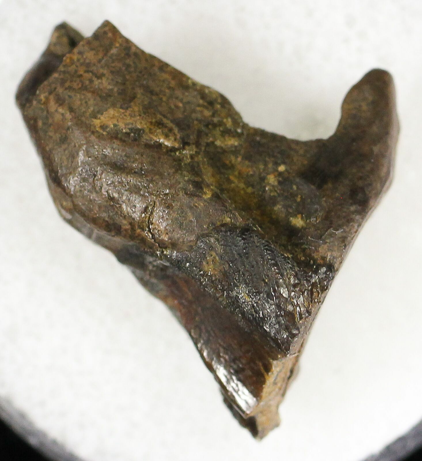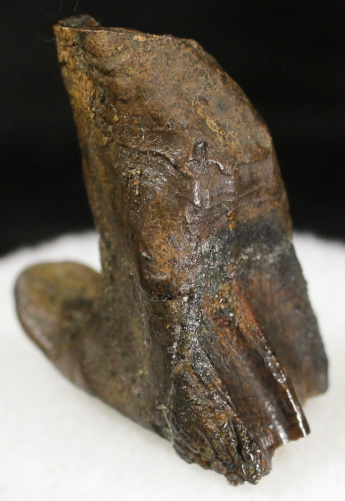 Here's a real tooth from one of the most iconic dinosaurs, Triceratops. It was collected in the 66 million year old, Hell Creek Formation of Montana. Triceratops had a massive battery of teeth in their mouth for chewing the rough vegetation that made up their diet. This tooth still retains much of it's root indicating it is not a shed tooth, but one that was separated from the skull after death. Given it's relatively small size, it likely came from a juvenile.