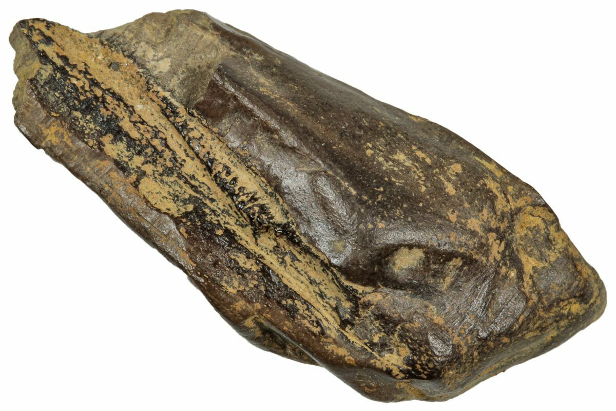 This specimen is one of those naturally shed teeth and features a polished chewing surface, showing clear evidence of the wear that came from processing vegetation millions of years ago.