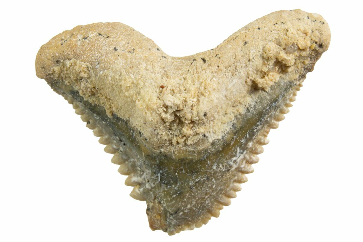 This is a .99" long, serrated, fossil Tiger Shark (Galeocerdo eaglesomi) tooth from the Eocene aged deposits near Dakhla, Morocco. Galeocerdo eaglesomi would be one of the early Tiger Sharks living approximately 45 million years ago.