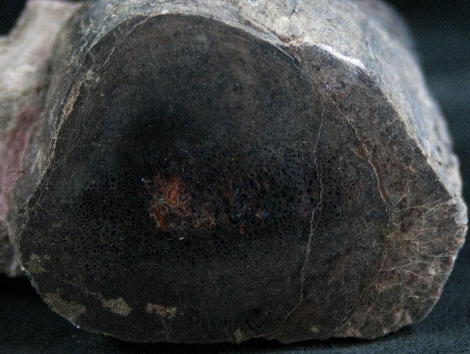 It comes from the Morrison formation of Colorado. The agatized bone is either found as fragments on the surface from bones or partial bones that have long since been destroyed by exposure to the elements, or as broken and tumbled chunks in event layers of the quarry. It could have come from any of a number of dinosaurs from this formation, though sometimes based on cell size and outer appearance the type can be narrowed down.