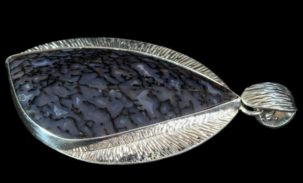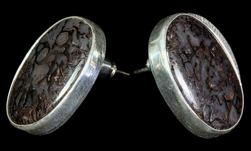 These are beautiful matching pendant and earrings made from 150 million year old agatized dinosaur bone. They were handcrafted in Utah. The internal cell structure of the dinosaur bone can clearly be seen. Only high grade, gem quality bone was used in these earrings and pendant and the setting is 100% sterling silver.