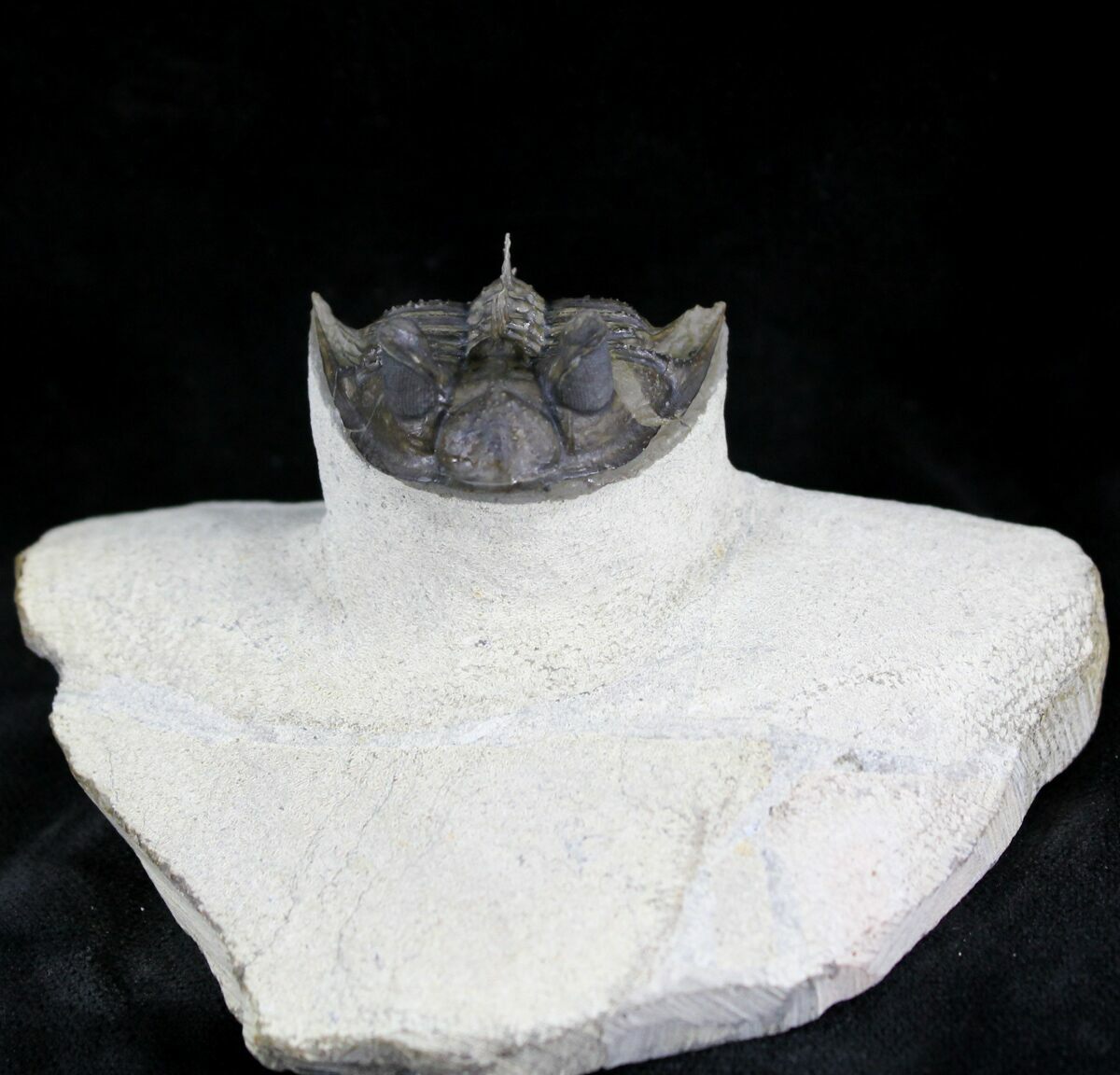 This a rare, tower-eye, Erbenochile issoumourensis trilobite from Foum zeguid, Morocco. This species has extraordinarily large eyes containing over 400 eye facets. The massive eyes allow full 360 degree coverage in the horizontal plane and were high enough to allow the trilobite to see backwards over its thorax.