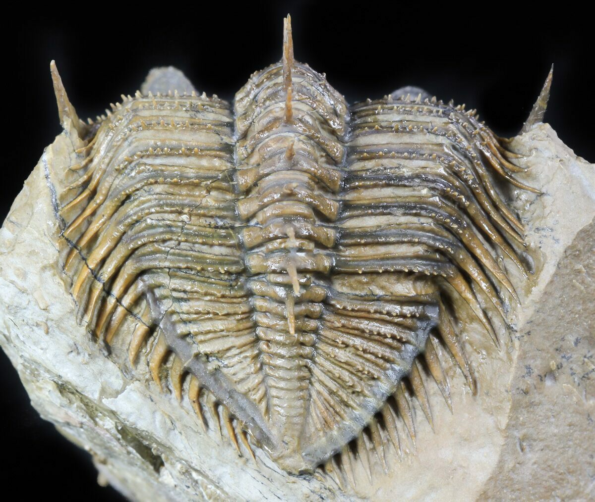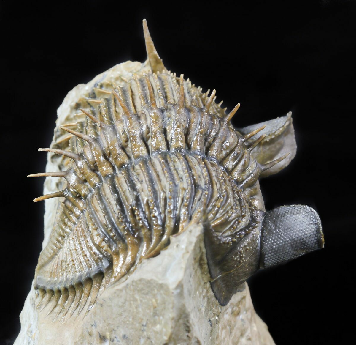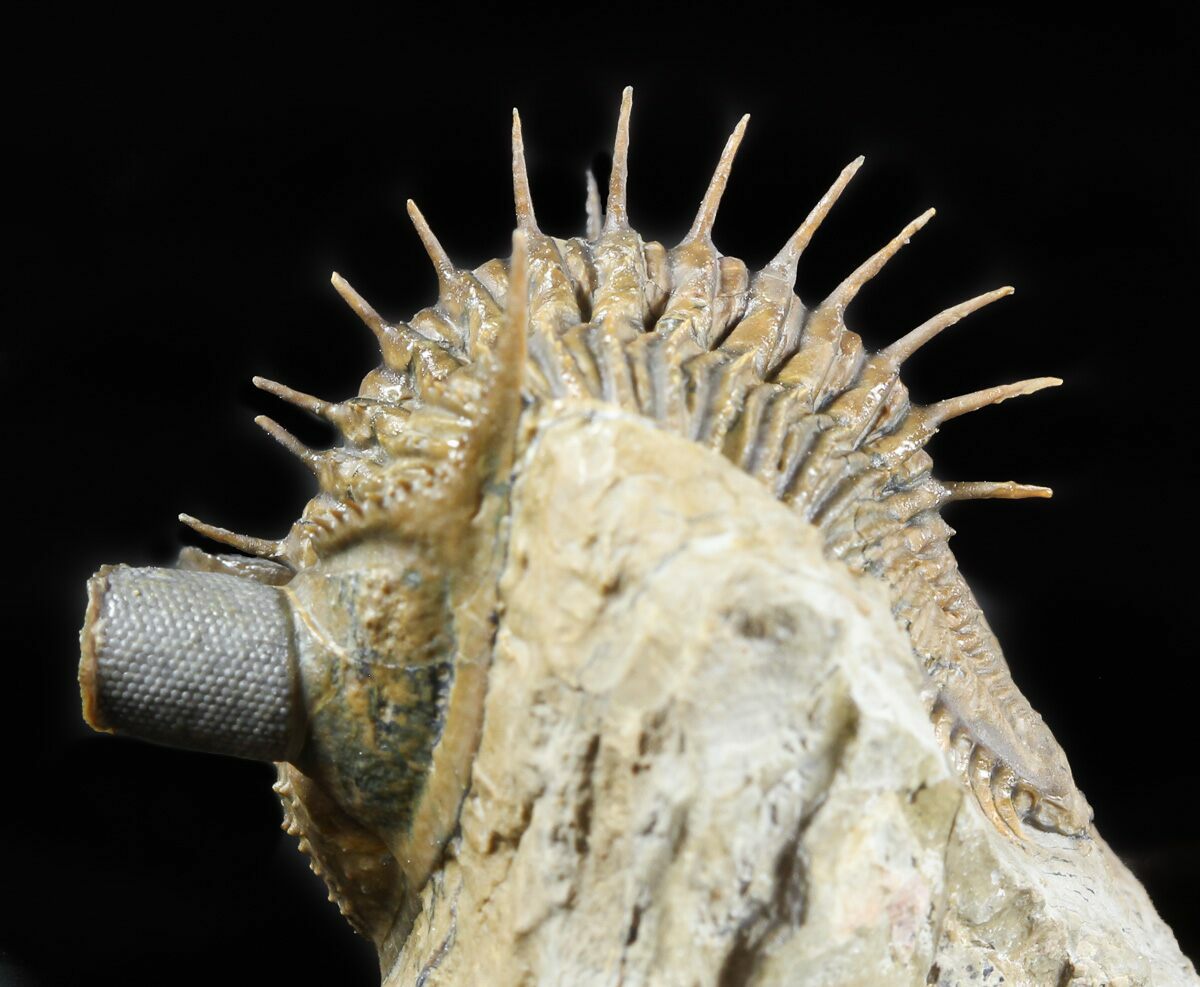 This a rare, tower-eye, Erbenochile issoumourensis trilobite from Foum zeguid, Morocco. This species has extraordinarily large eyes containing over 400 eye facets. The massive eyes allow full 360 degree coverage in the horizontal plane and were high enough to allow the trilobite to see backwards over its thorax.