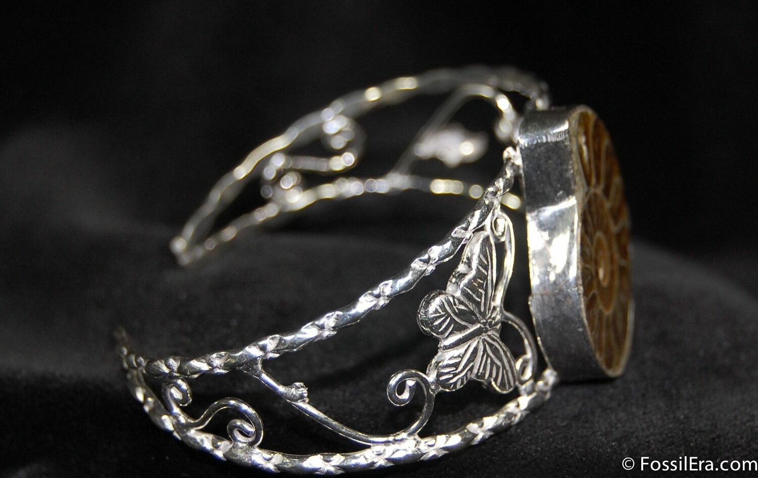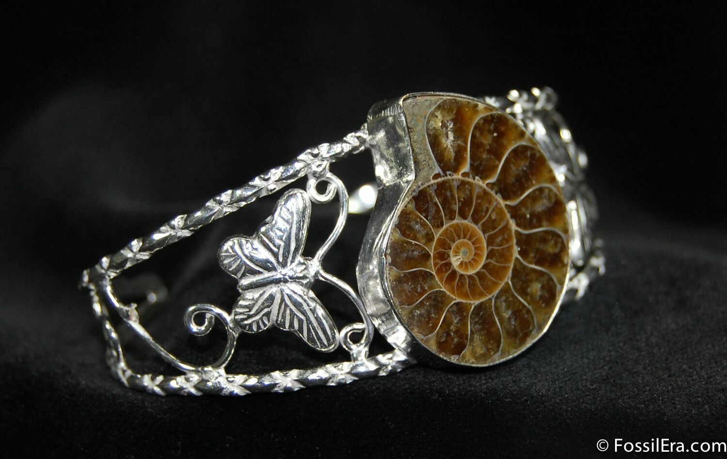 Here is a unique piece of fossil jewelry, it's a bracelet featuring a real cut and polished ammonite fossil. The ammonite is approximately 110 million years old from Madagascar.