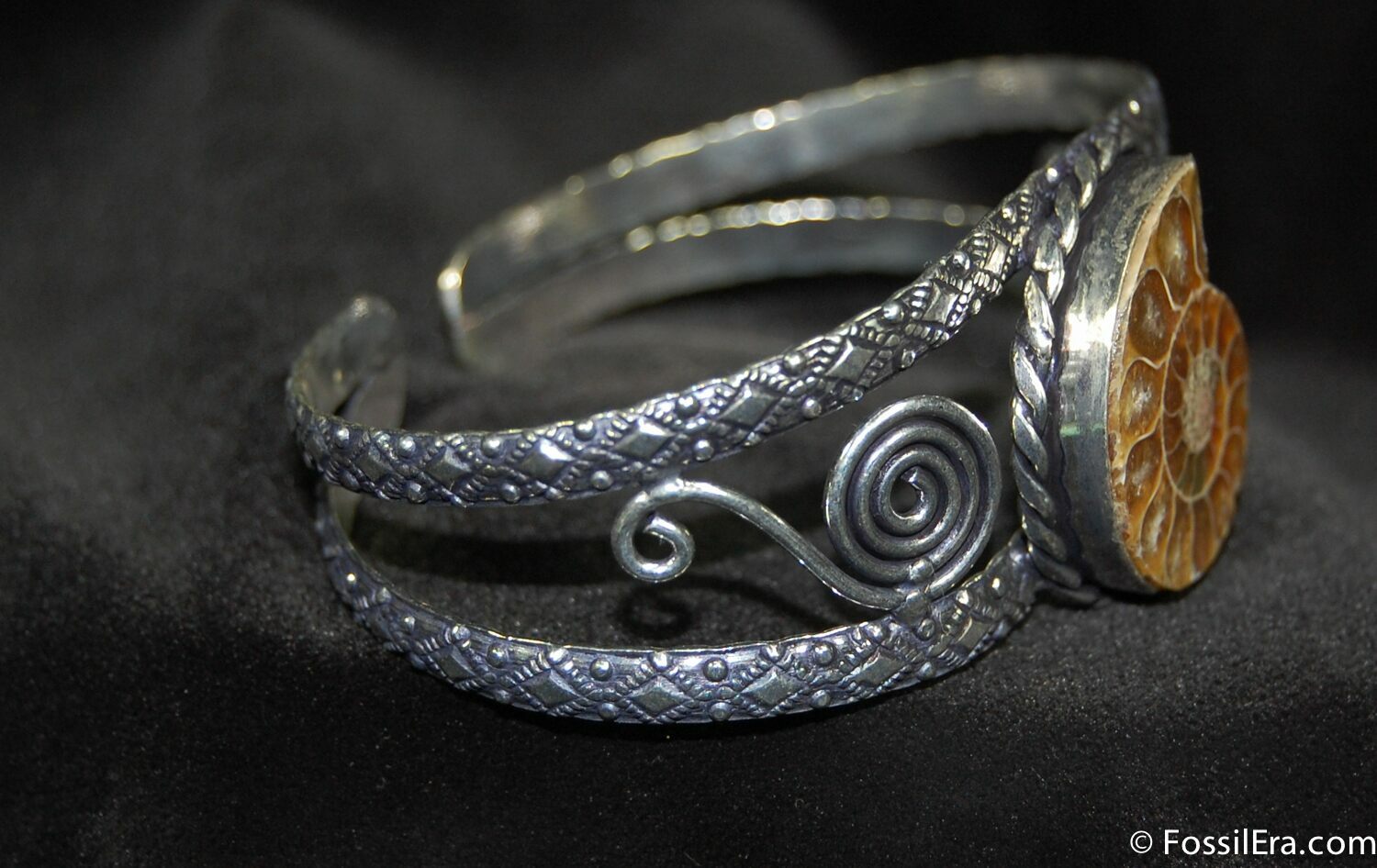 Here is a unique piece of fossil jewelry, it's a bracelet featuring a real cut and polished ammonite fossil. The ammonite is approximately 110 million years old from Madagascar.