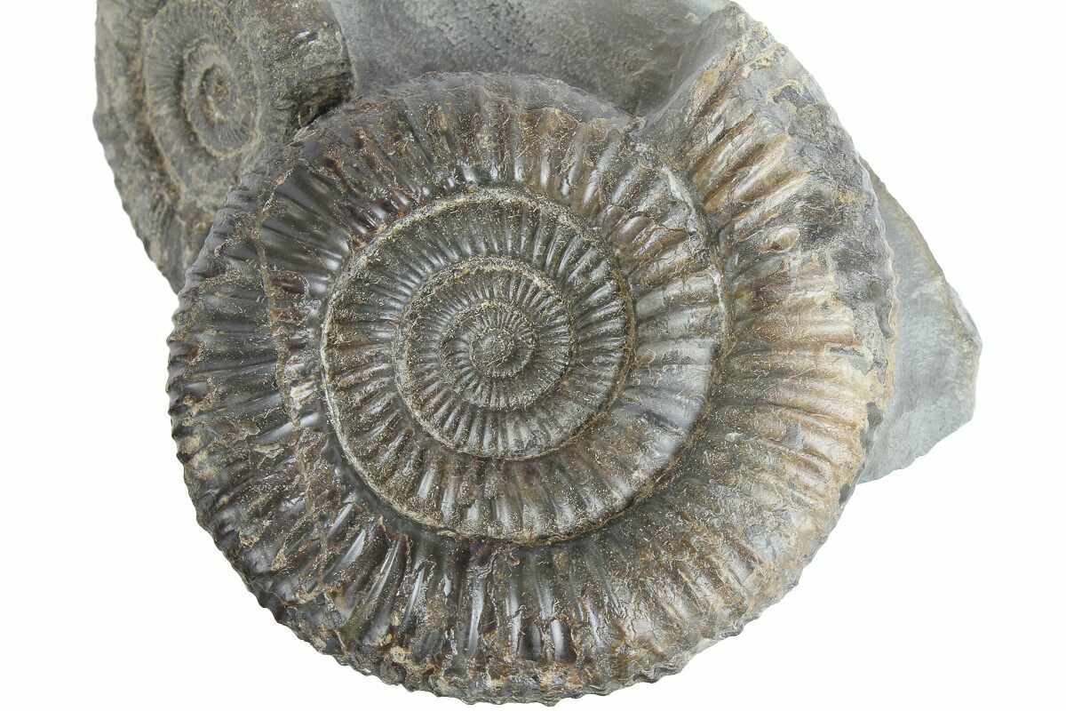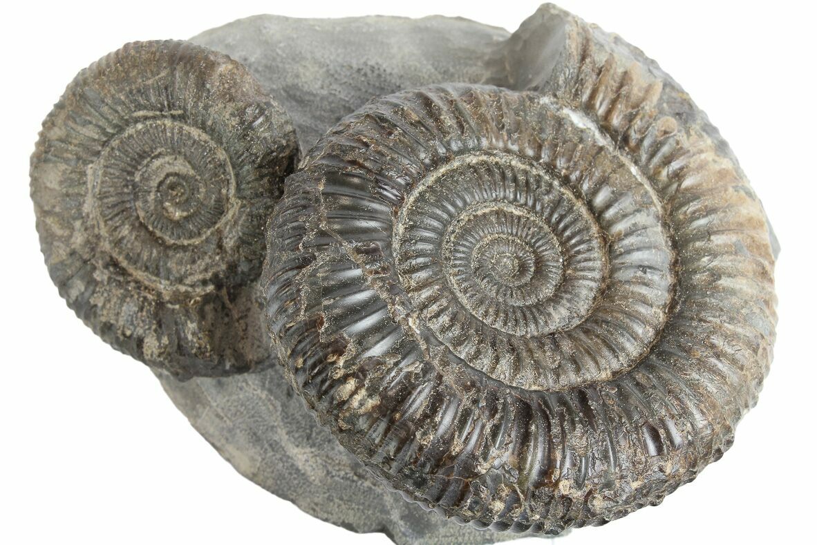 This is a pair of classic British ammonites of the species Dactylioceras commune. These well preserved ammonites are Jurassic in age and are found in hard concretions that must be split open to reveal the fossil. The hard rock then has to be removed mechanically to further expose the fossil.