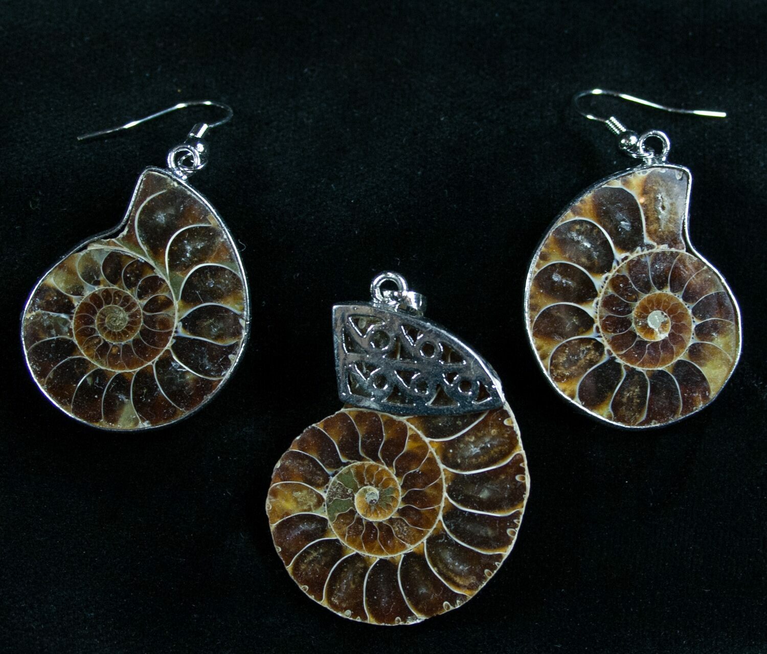 This is a beautiful pendant and earring set featuring real 110 million year old, cut and polished ammonite fossils from Madagascar.