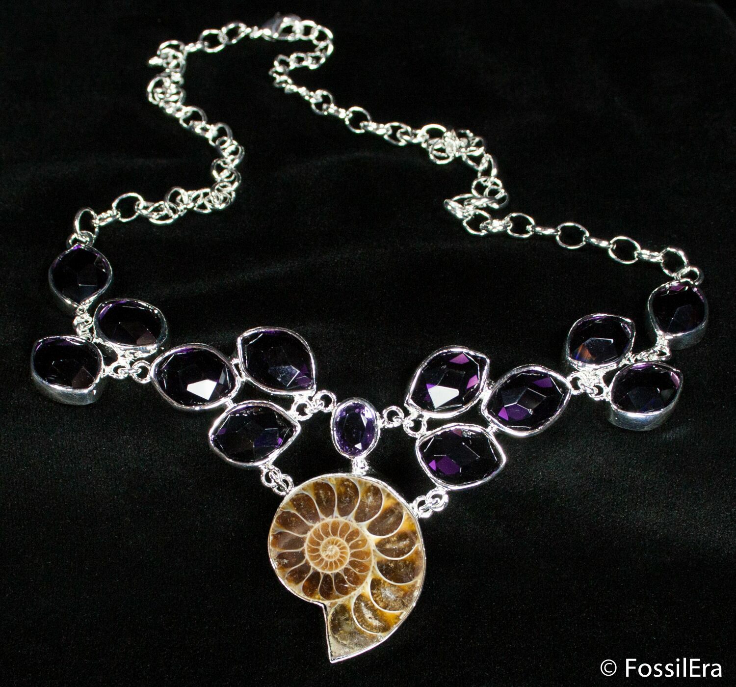 Here is a unique piece of jewelry featuring real cut and polished ammonite fossils from Madagascar and amethyst gemstones (lab created).
