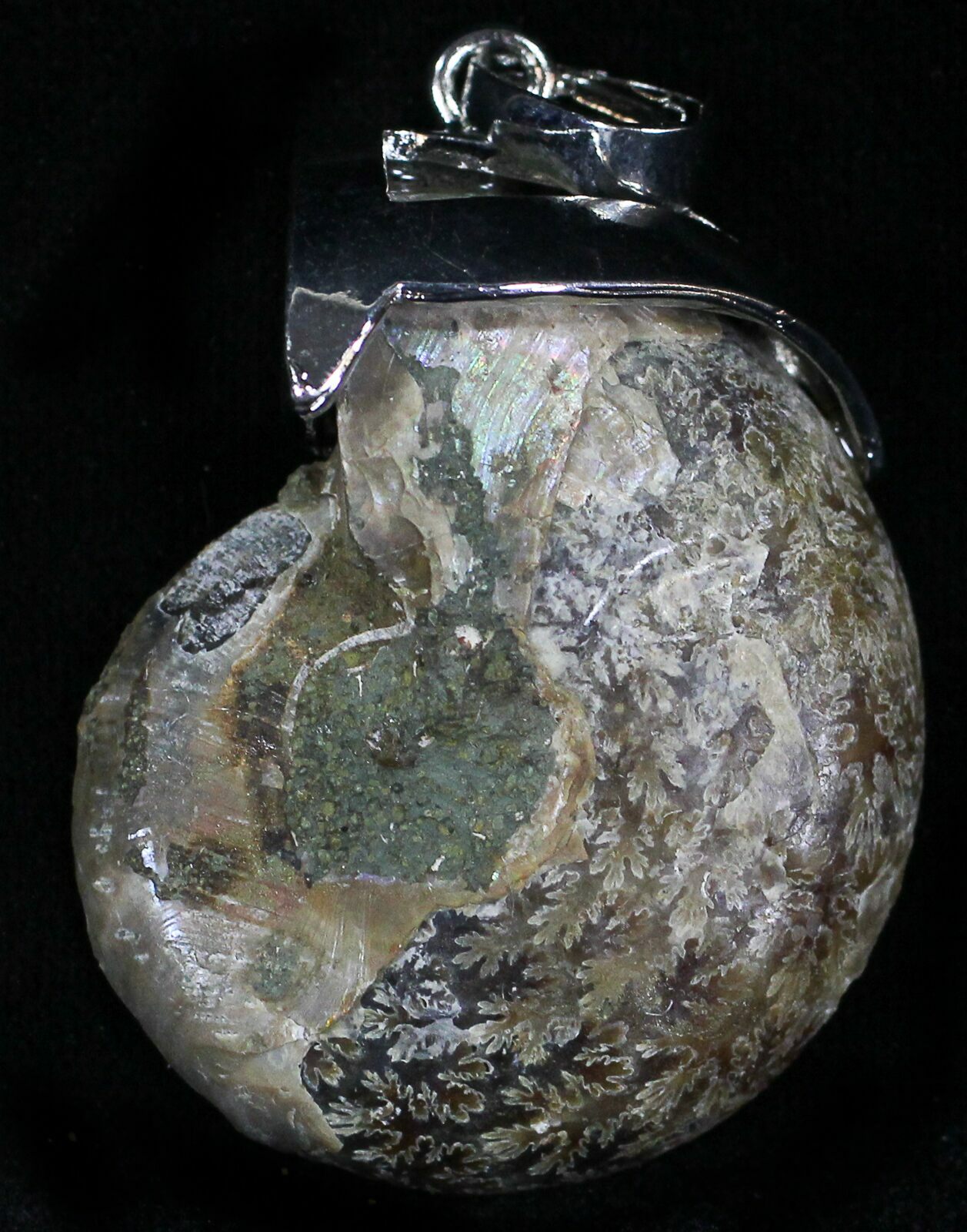 Here is a unique piece of jewelry featuring a real cut and polished ammonite fossil from Madagascar.