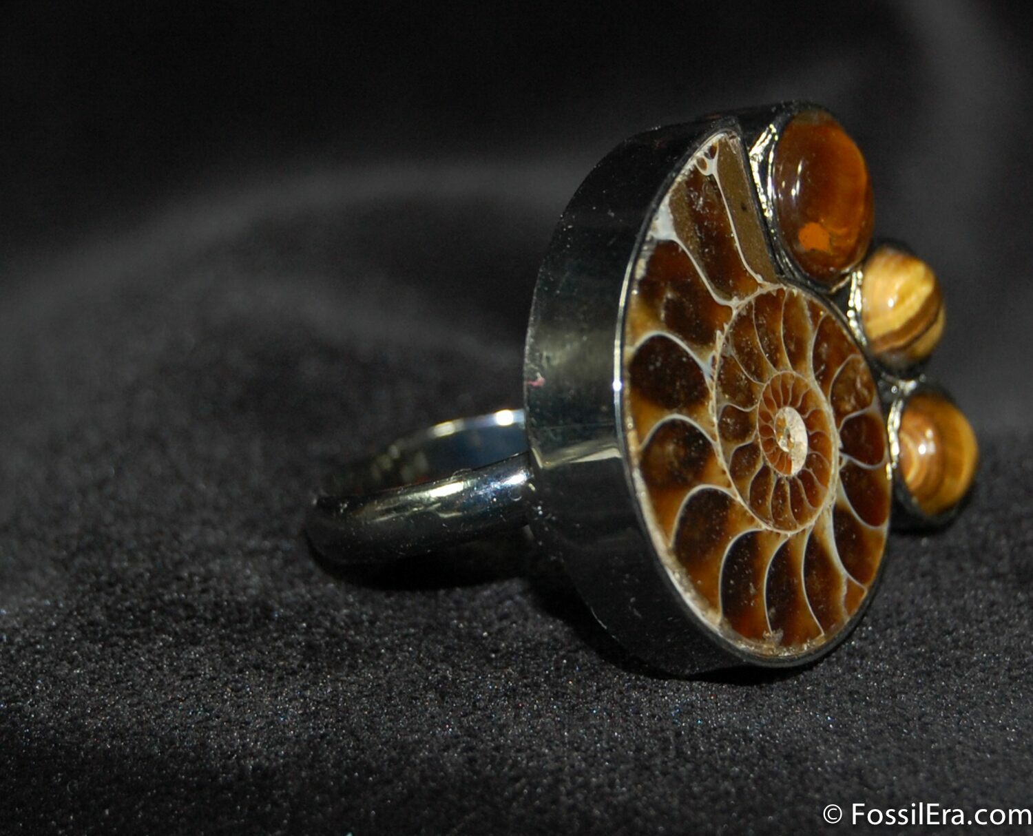 Here is a unique piece of jewelry featuring a real cut and polished ammonite fossil from Madagascar. The .9 inch wide ammonite approximately 110 million years old and from the genus Desmoceras.